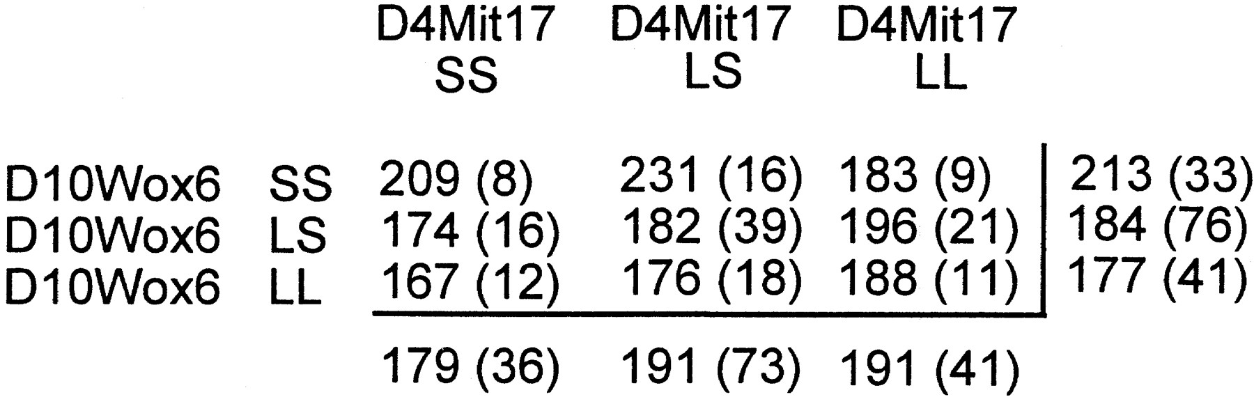 Interaction of the blood pressure effects linked to markers D10Wox6 and D4Mit17. (Top) The cell means for systolic blood pressure; the number of rats for each cell is in parenthesis; marginal means are also given. The interaction term from a 2 × 2 factorial analysis of variance had P = 0.002. (Bottom) (•) SS D4Mit17; (•) LS D4Mit17; (▴) LL D4Mit17.
