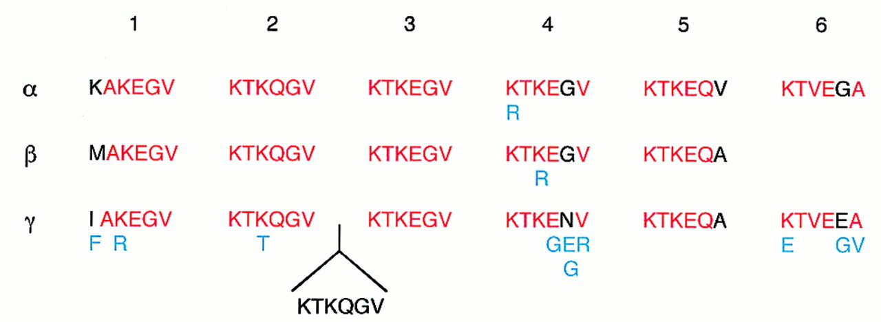 Comparison of the repeated domains in the synuclein proteins. Repeated domains are numbered from 1 to 6, from the amino to the carboxyl terminus. For each class of synuclein, the residues of the human protein are shown with the changes observed in other species indicated below in blue. For each domain, the consensus residues for the three human synucleins are shown in red. Note the insertion of an additional domain in T. californica, between domains 2 and 3.