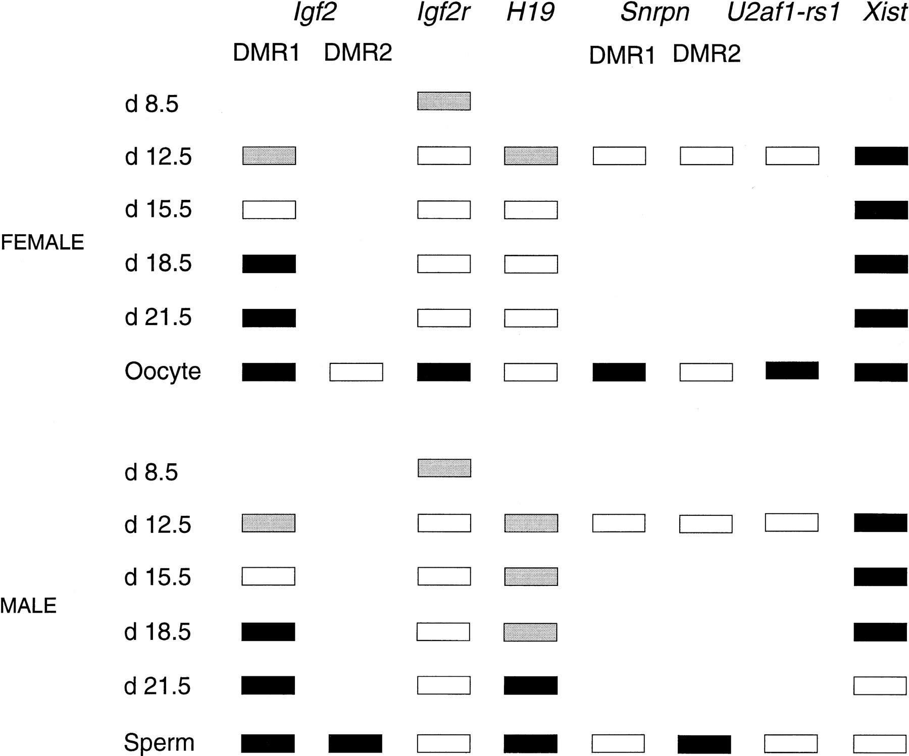 Methylation patterns in imprinted genes in the germ line. The stages of germ cell development analyzed for each imprinted gene are indicated. (Solid box) Complete methylation; (shaded box) partial methylation; (open box) no methylation. (See text for details and references.) (DMR) Differentially methylated region.