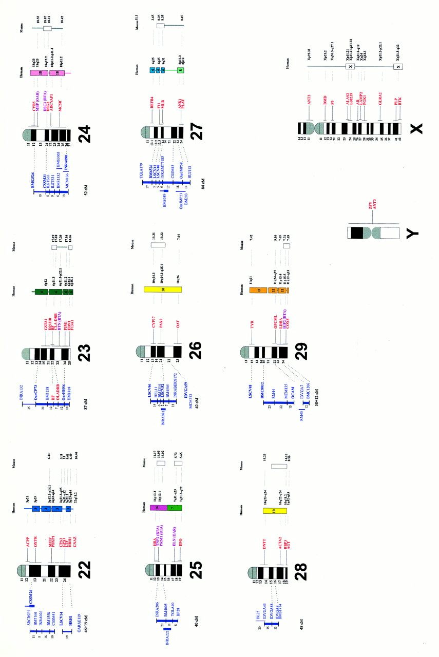 The goat genetic and cytogenetic integrated map. Genetic maps are drawn in blue on the left of the standard karyotype. Distances are reported in cm without the correction of Kosambi. The thickness of the lines is based on the two-point lod score between adjacent markers: thick lines for lods >3, medium for lods comprised between 2 and 3, and thin for lods <2. Markers that could not be positioned precisely in linkage groups are displayed in the most probable interval, by a line parallel to the chromosome. Markers cytogenetically mapped are figured in bold. (Right) Gene localizations are drawn in red (present work), in red with an asterisk (mapped previously in goat), and in violet (mapped in cattle or sheep). When known, human and mouse localizations are shown with regard to goat localization. Corresponding human chromosome regions are represented by colored lines for synteny (one color for each human chromosome) or boxes for conserved segments. Murine homologous regions are shown likewise by lines or open boxes.