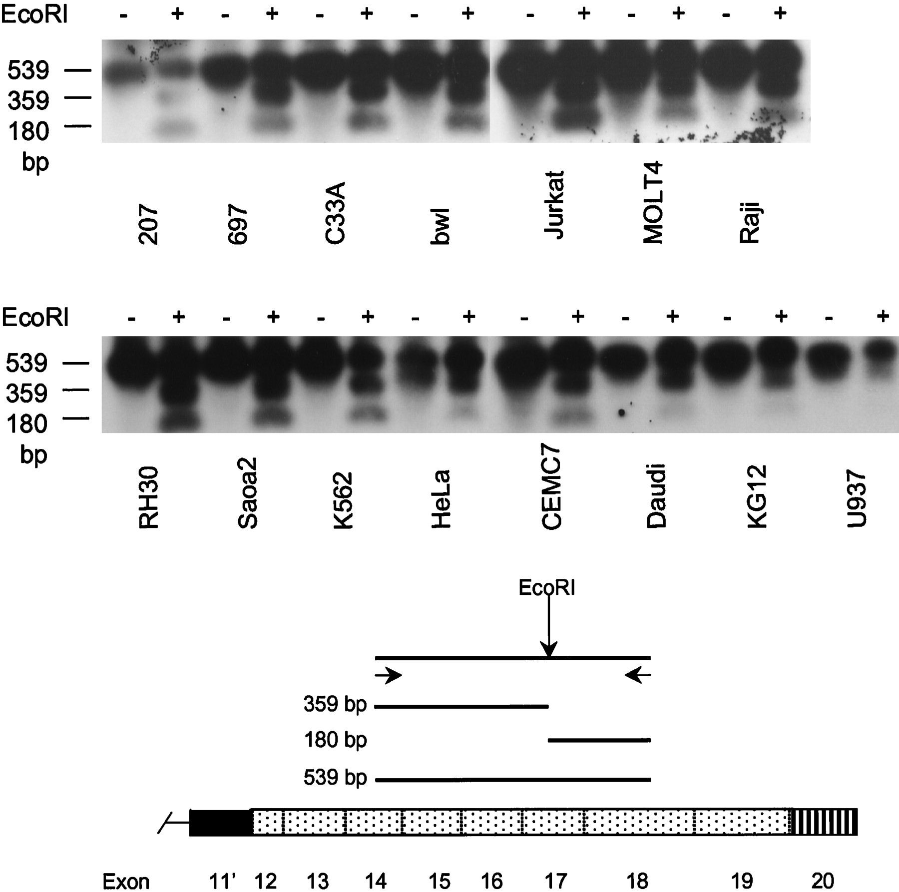 PCR–LR analysis of Cdc2L1 and Cdc2L2 mRNAs expressed by various cell lines. An analysis of the expression of Cdc2L1and Cdc2L2 using a unique EcoRI restriction site found in exon 17 of Cdc2L2 (bottom) was performed by RT–PCR. The undigested (−) and EcoRI-digested (+) RT–PCR products were separated by agarose gel electrophoresis, transferred to a membrane, and hybridized with the PITSLRE cDNA. Whereas most cell lines express both Cdc2L1 andCdc2L2 transcripts, Daudi and U937 cells appear to express primarily Cdc2L1 mRNA, which lacks the diagnosticEcoRI site. (Bottom) A schematic of Cdc2Lstructure relative to the location of the PCR primers used in this analysis. The expected sizes of the undigested (539 bp) and digested (359 and 180 bp) products is also indicated.