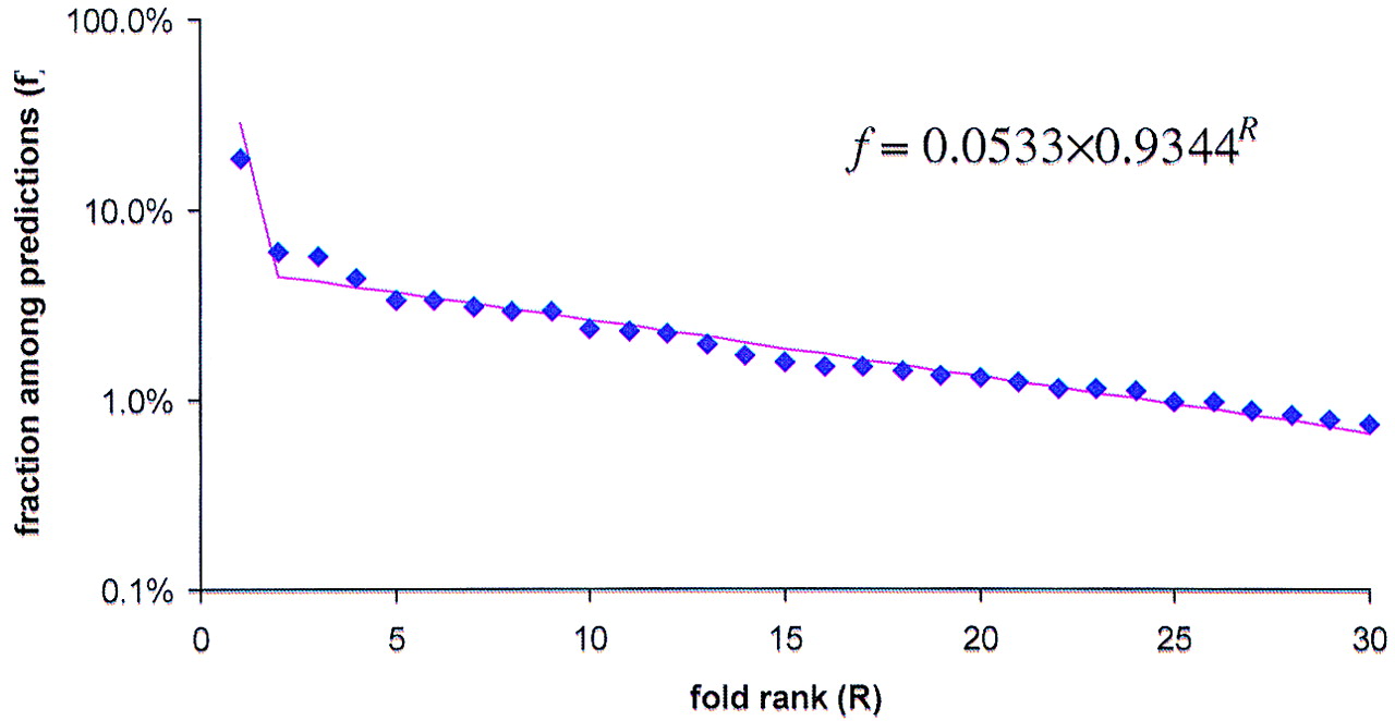 Rank distribution of the unweighted average fraction of the top 30 protein folds in proteomes. (Blue diamonds) The observed unweighted average fractions of folds; (magenta line) The best-fitting exponent approximation.