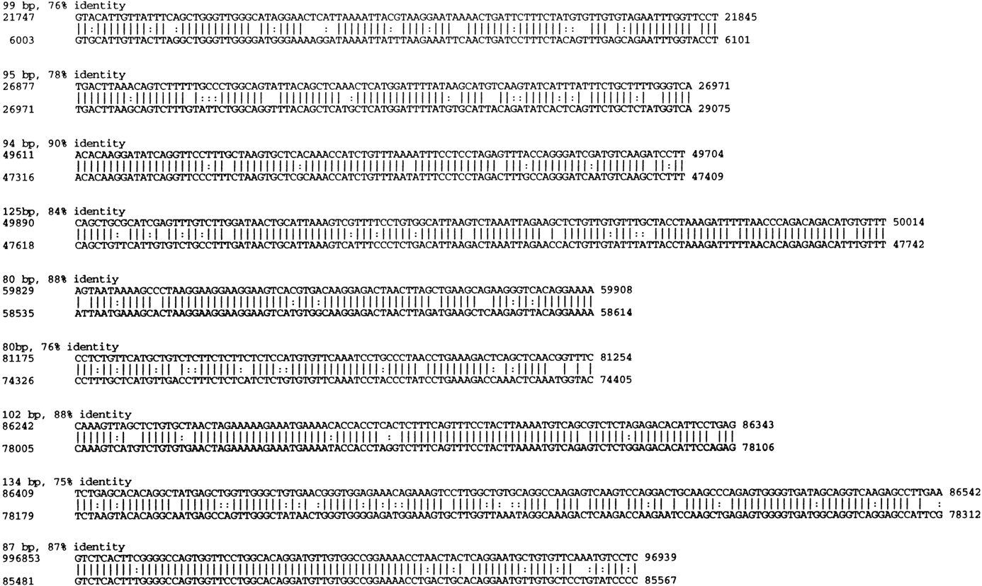 Evolutionarily conserved sequence blocks in the introns ofD6Mm5e. Nine conserved elements ⩾80 bp in length with nucleotide sequence identity ⩾75% were identified. The sequences of the mouse elements (GenBank accession no. AF084363; top line) are aligned with the human sequence (GenBank accession no. AA003065). The first and last nucleotides of each element are numbered. Eight elements are located at corresponding positions in human and mouse. The coding sequence of mouse D6Mm5e begins in exon 1 at nucleotide 18441 and the polyadenylation signal begins at nucleotide 99125 in exon 9.