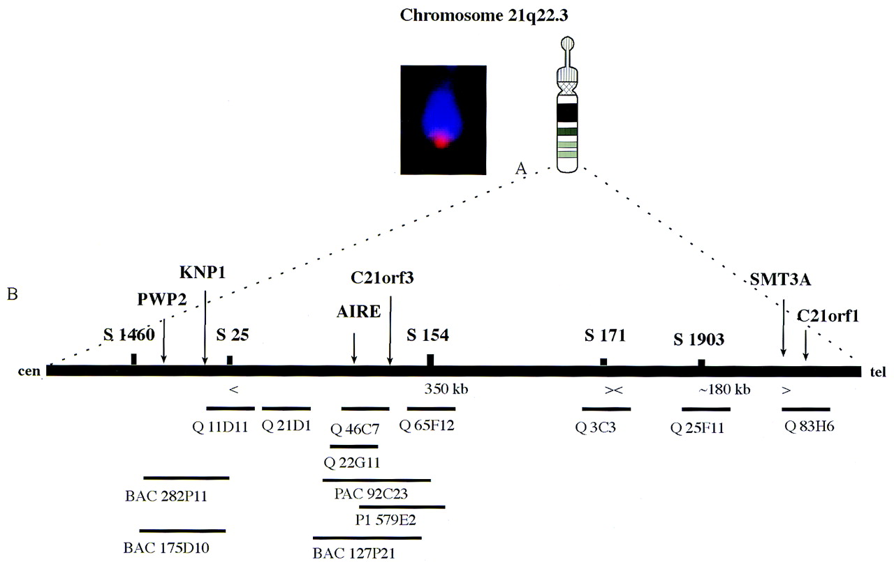 (A) A metaphase chromosome showing a specific hybridization signal of an amplified EST fragment detected by tyramide-based detection (left) and an idiogram of the chromosome 21 (right). (B) A schematic representation of the critical genome region including the markers D21S1460 and D21S1903 on the chromosome 21q22.3. The locations of the genes of interest are positioned according to the known markers and to the clone contig established earlier (Aaltonen et al. 1997a). Symbols above the long solid bar represent polymorphic markers. The short horizontal bars represent clones where Q stands for cosmid clones.