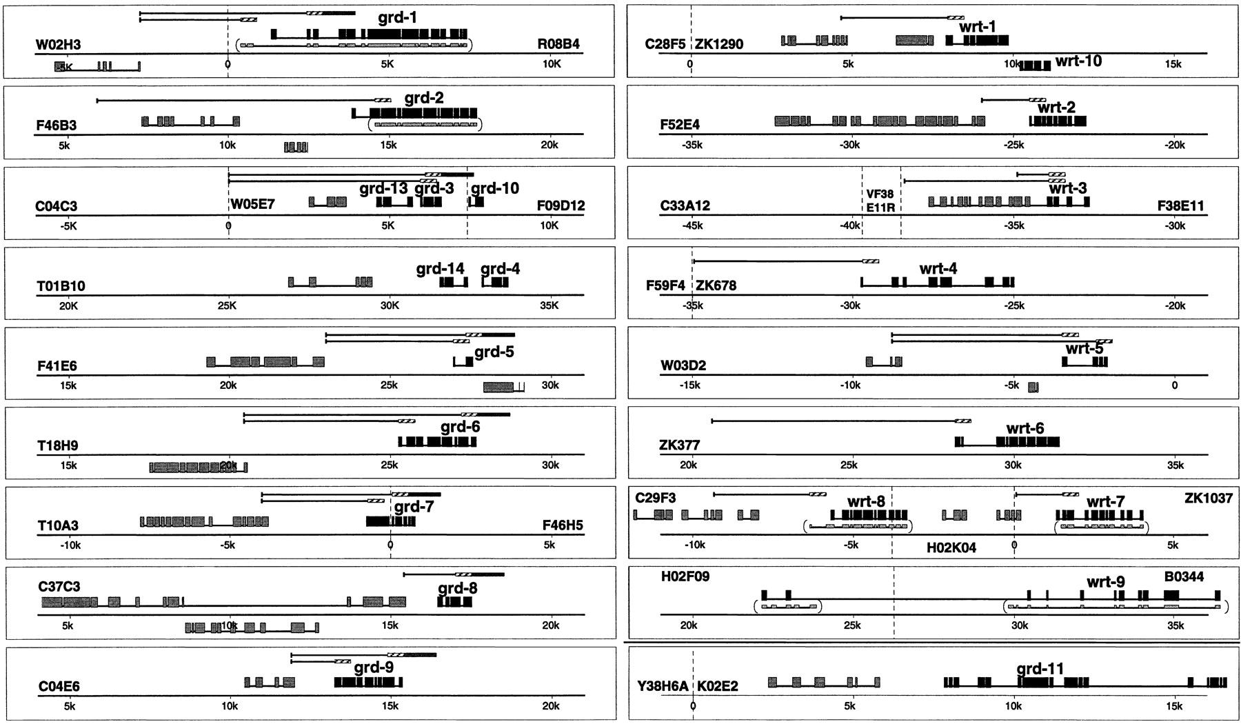 Genomic structure and reporter constructs. ORFs are indicated above the chromosome, represented by the different cosmids. ORFs in black aregrd and wrt genes, gray ORFs are neighboring genes, small gray ORFs beneath grd or wrt genes are the computer predictions from ACeDB. Fragments used for reporter constructs are drawn above the respective ORFs: (gfp) Hatched boxes; (lacZ) dark gray boxes. wrt-7 and wrt-8 are separated from each other by two intervening ORFs, which are themselves a tandem duplication. Upstream of wrt-8, two otherH02K04-1A related ORFs are also present, indicating that a duplication of this whole gene cluster occurred.