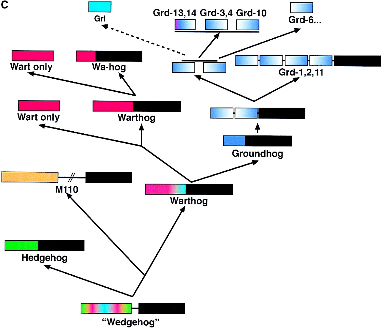 Hypothesis for the structure and evolution of the hh, wrt, grd, and grl genes. The green bars denote α-helixes, and the purple arrows β-strands in A and B. (A) Schematic representation of the different conserved domains and the amino-terminal region of M110. The yellow lines indicate conserved cysteine residues. The red box indicates the conserved FDφV motifs found in variations in all sequences. The brackets indicate putative cysteine disulfide bonds. Underneath the several domains are schematic representations of the secondary structure (Hedge) or secondary structure predictions (Grd, Grl). (B) The central part of the Shh-H structure viewed with RasMol; (right) β-strand 3 and 4 were removed. The FDφV motif is represented in red, the cysteine residues in yellow. The scheme at right is a topologically allowed scheme of how the Ground and Ground-like domain could be arranged. (C) Evolution of the hog gene families from a common ancestralwedgehog gene. Genes are represented schematically; the regions between the domains not drawn to scale. The black box denotes the Hog region; the other colors the different amino-terminal domains, i.e., Hedge, Wart, Ground, and Ground-like.
