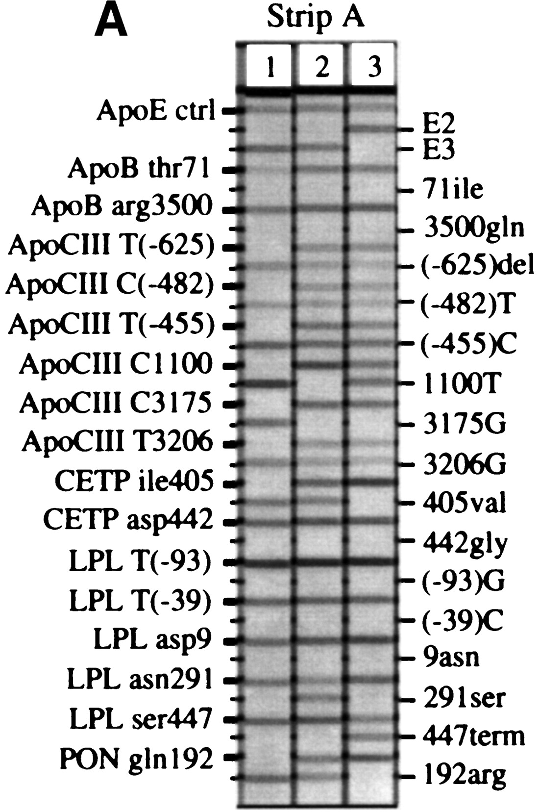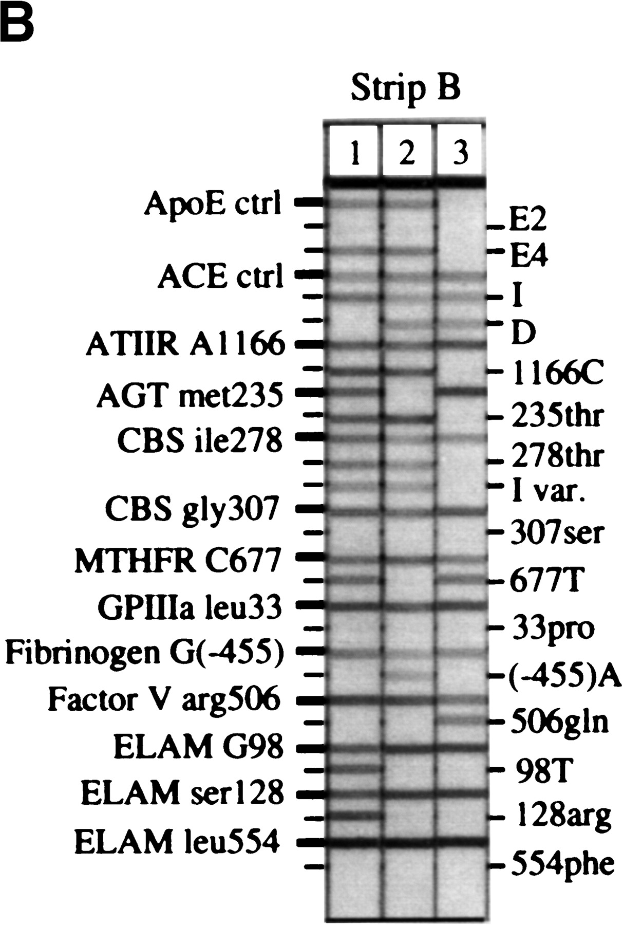 Representative probe strips demonstrating the identification of different alleles. Genomic DNA samples were amplified with either the multiplex A (A) or the multiplex B (B,C) primer pool, then hybridized to the corresponding immobilized probe strips, as described under Methods. Five examples each of probe strips A and B are shown; only two examples of probe strip B2 are shown. For the purpose of illustrating a range of different genotypes, the individuals typed here in A do not correspond to those inB or C. On each vertical strip, alleles amplified from the original sample are indicated by horizontal lines. The template guides at the left and right identify the allele detected at each probe position. With the exception of apoE3, ACE-I, andACE-D, the less prevalent genetic variant for each marker is listed on the right. Differences in the relative efficiencies of amplification and probe hybridization contribute to the variation in the actual intensity among the loci. (In actual size, each strip is ∼8 cm long.)