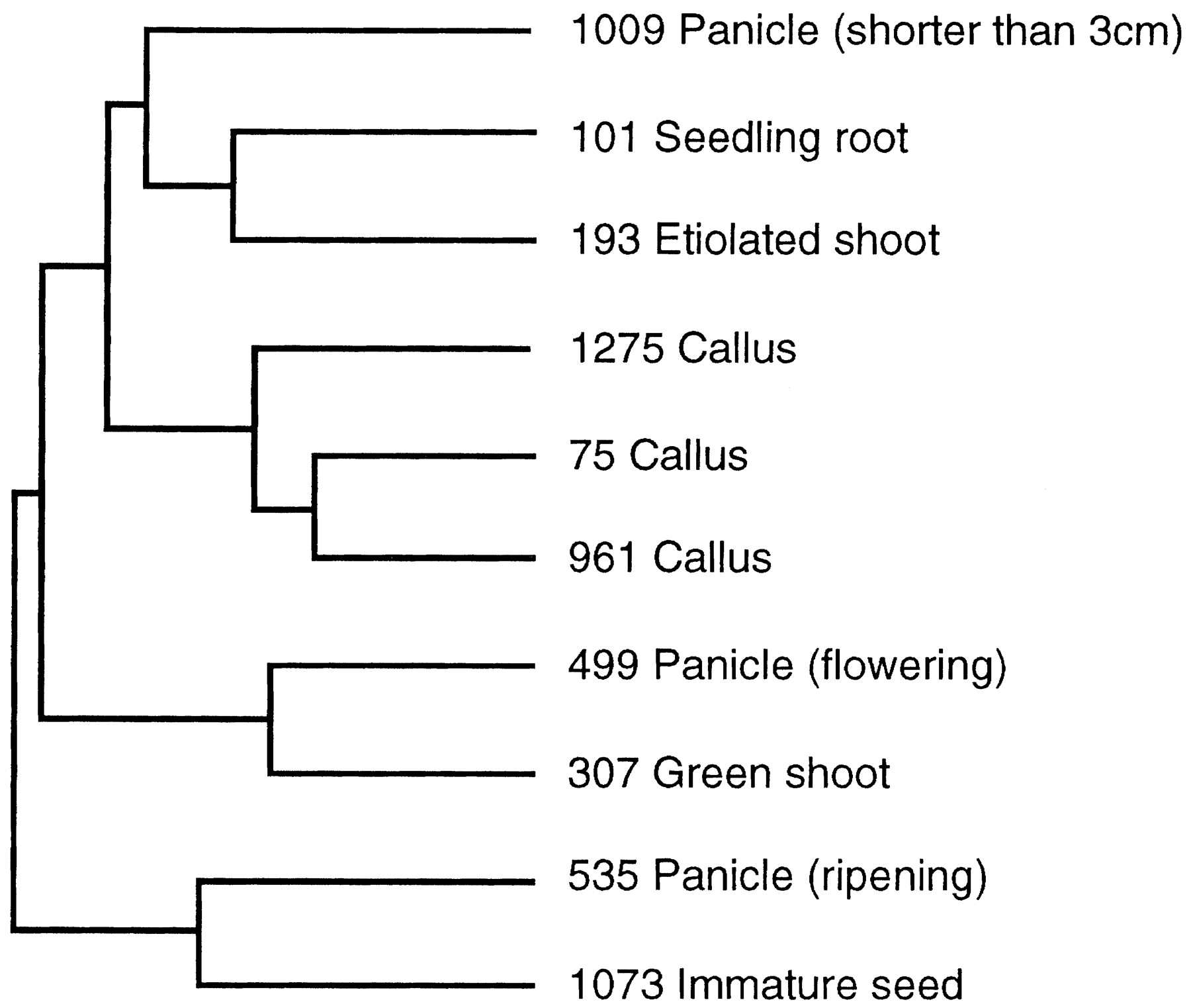 Dendrogram showing cDNA library similarities. Each library is identified by the dbEST library identifier and a short description.