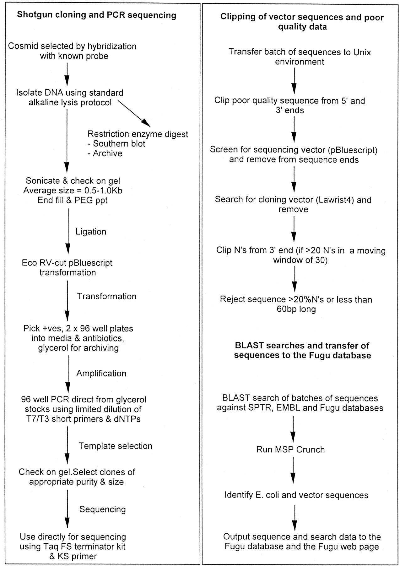 Flow diagram of sequence generation and processing. (Left) How the sequence templates are generated; (right) the processing of the sequences and their subsequent presentation on the web with associated BLAST results.