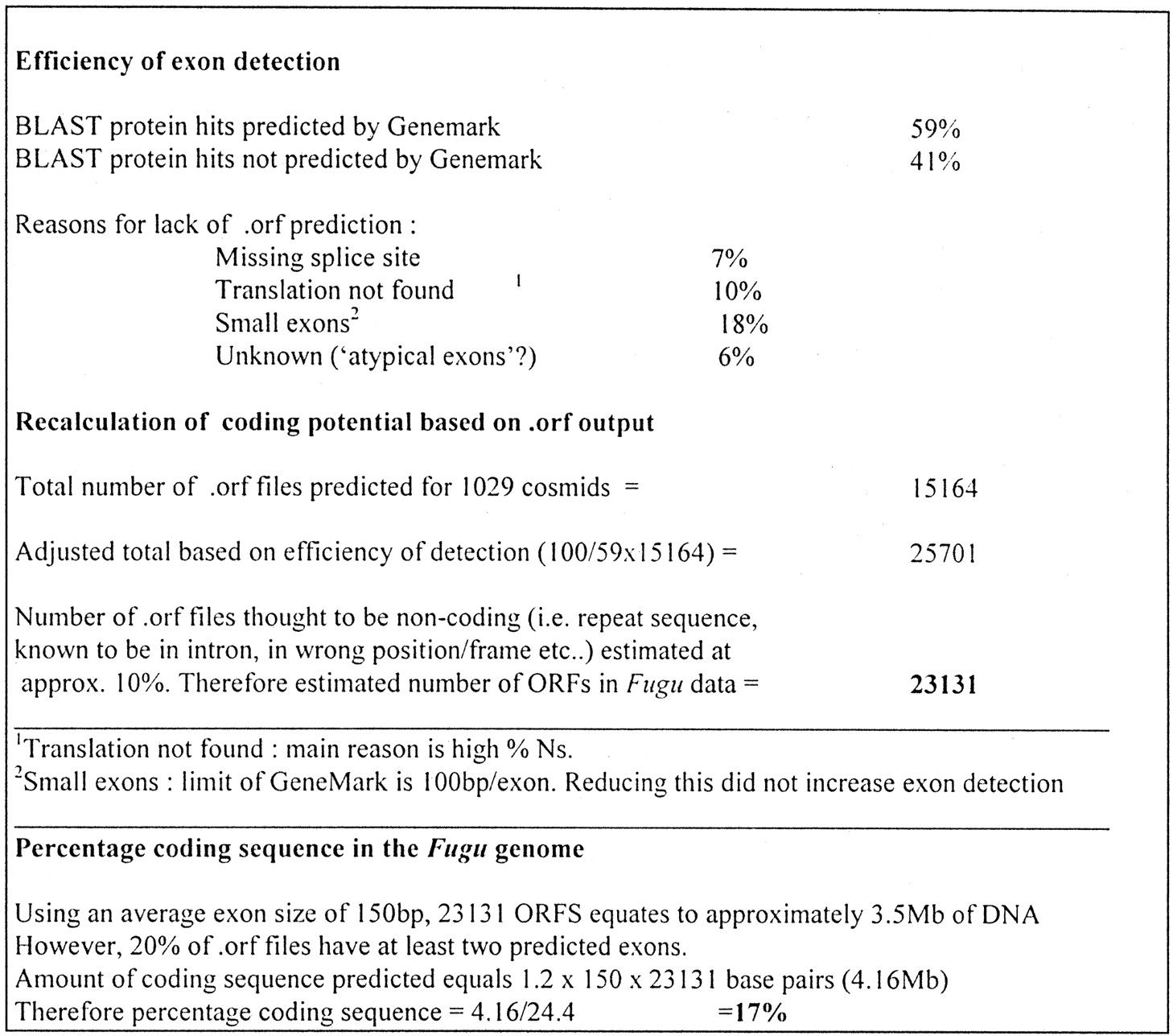Percentage coding sequence in the Fugu genome as calculated from GeneMark ORF output. The Genemark program was run on all 52,668 sequences and the output of 964 of these, from 16 cosmids was used for the calculations of efficiency and accuracy. We have defined a correct Genemark prediction when a listed region of interest, and at least one exon prediction, is in the correct region and the reading frame of the sequence matches the confirmed BLAST hit.