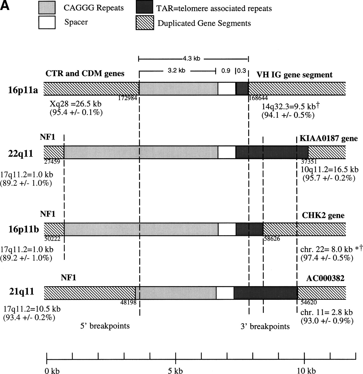 Duplicated genomic segments flank the CAGGG repeat structure. (A) Four human CAGGG repeat elements [21q11, 22q11, and two from 16p11 (a and b)] were identified based on BLAST sequence similarity searches of htgs and nr divisions of GenBank (accession nos.AC004527, D87003, AC002041, and AC002402, respectively). Multiple pairwise sequence alignments (CLUSTA W) were used to determine the extent of the repeat structure. The diagram shows the structure of the repeat element, composed of (1) an interspersed CAGGG repeat block (mean length = 4490 bp; range, 2937–5915 bp), (2) a short spacer region (mean length = 881 bp; range, 851–943), and (3) a variety of subtelomeric-like repeat sequences (HSREP522, HSREP271, TAR, HSREP282) (mean length = 1899 bp; range, 793–3018 bp). Broken lines represent breakpoints within the aligned repeat units. Analysis of sequences flanking the repeat structure identified paralogous gene structures located near or at the boundaries of each repeat. The duplicated genic segments are shown as hatched bars. Numbers below these boundaries refer to the breakpoint positions within the GenBank accession. The percent sequence similarity, the location of the ancestral sequence, and the estimated size of the duplication are summarized below each bar. (*) Calculation of sequence similarity was based on sim4 comparisons of cDNA and genomic segment. (†)Minimal size of duplicated region was based on the genomic distance between first and last paralogous exons. All interchromosomal duplication boundaries were confirmed by PCR amplification and sequencing of products from a monochromosomal somatic cell hybrid panel. (B) The location of the 3′ boundary of the repeat element with respect to various telomere-like repeat elements is shown in greater detail. Note the preponderance of breakpoints near or within the HSREP522 (R522) element.