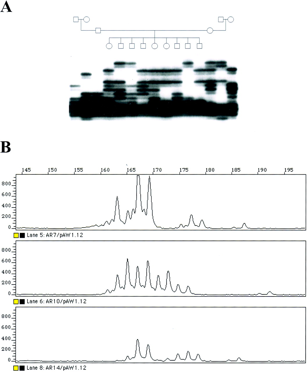 Analysis of (CA)n repeat D21S188. (A) Segregation analysis of D21S188 in CEPH pedigree 1347 using a radiolabeled PCR primer and autoradiography. (B) Fluorescent analysis of D21S188 in three at random individuals.