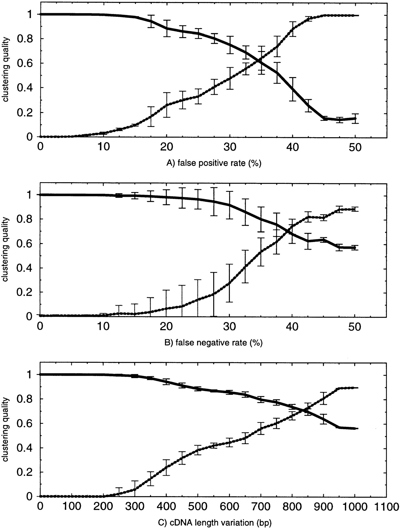 Simulation studies. Clustering is tested on three error parameters: (A) false-positive rate, (B) false-negative rate, and (C) cDNA length variation. False-positive rate and false-negative rate are measured in percents, and length variation is measured in base pairs. Clustering quality is calculated according to two different quality measures: (Broken lines) The relative Minkowsky metric, which is low if clustering quality is good and high if clustering quality is bad; (solid lines) the RMIC, which is high if clustering quality is good and low if clustering quality is bad. For each parameter size, 20 independent clusterings are performed to derive the mean (μ) and the s.d. (ς). The bars indicate the interval [μ − ς, μ + ς].