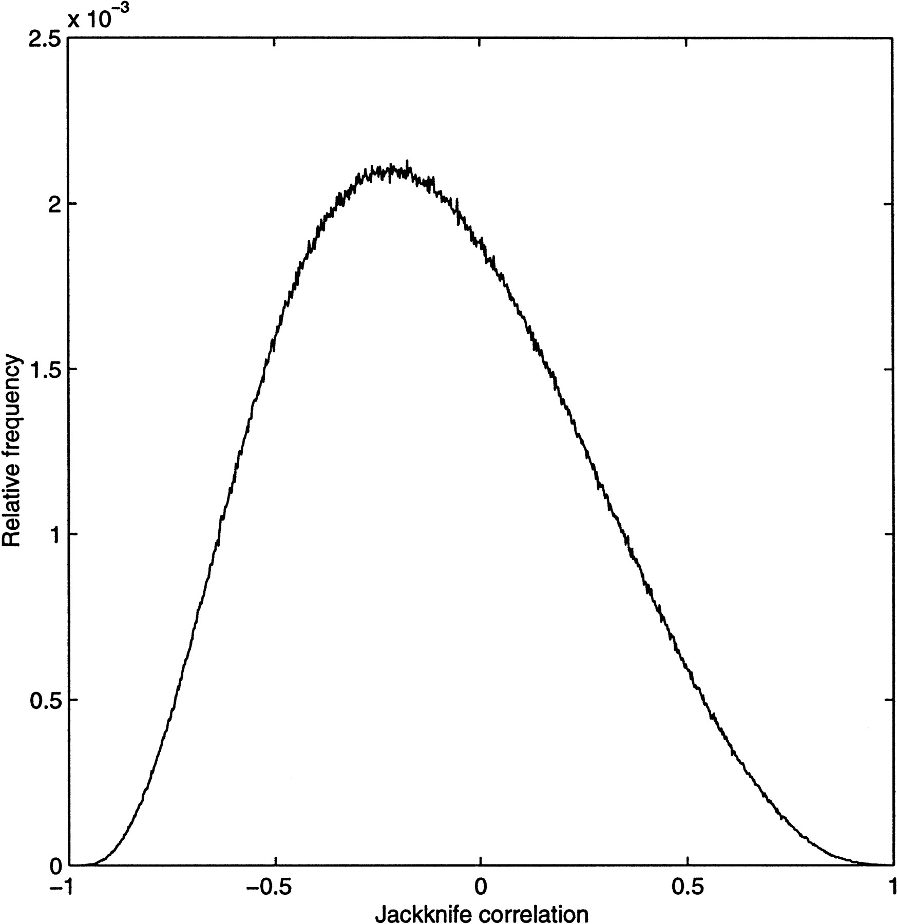 Relative frequency histogram of jackknife correlation values. All 8,688,196 pairwise scores are represented. The number of pairs in each bin is normalized by this total.