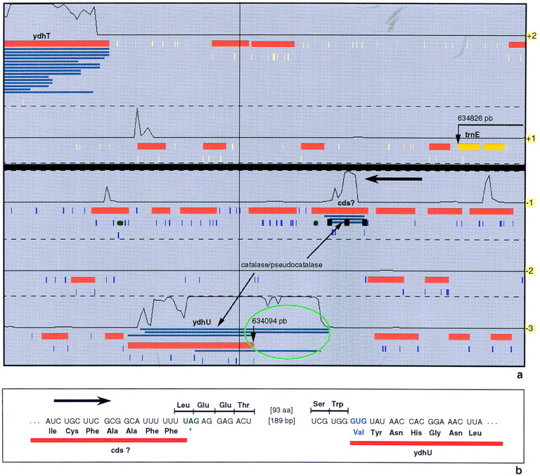 Example of an authentic frameshift corresponding to a putative programmed frameshift. (a) Representation of theydhT-trnE B. subtilis region with the Imagene Results Manager. (b) DNA sequence corresponding to the end of the cds? putative gene and the beginning of the ydhU gene. A −1 frameshifting at the UUU UUU slippery sequence will lead to the expression of a gene whose product exhibits some similarities with catalase.