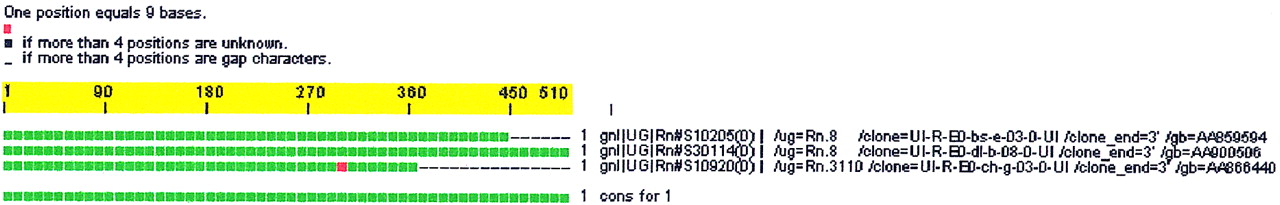 (A) CRAW report (Burke et al. 1998) for a cluster formed by d2_cluster that contains two UniGene clusters: Rn.8 and Rn.3110. (B) (Available as on online supplement to this paper atwww.genome.org and at the authors web site at www.pangeasystems.com) Interleaved sequence alignment shows a >300-bp region of near perfect match.