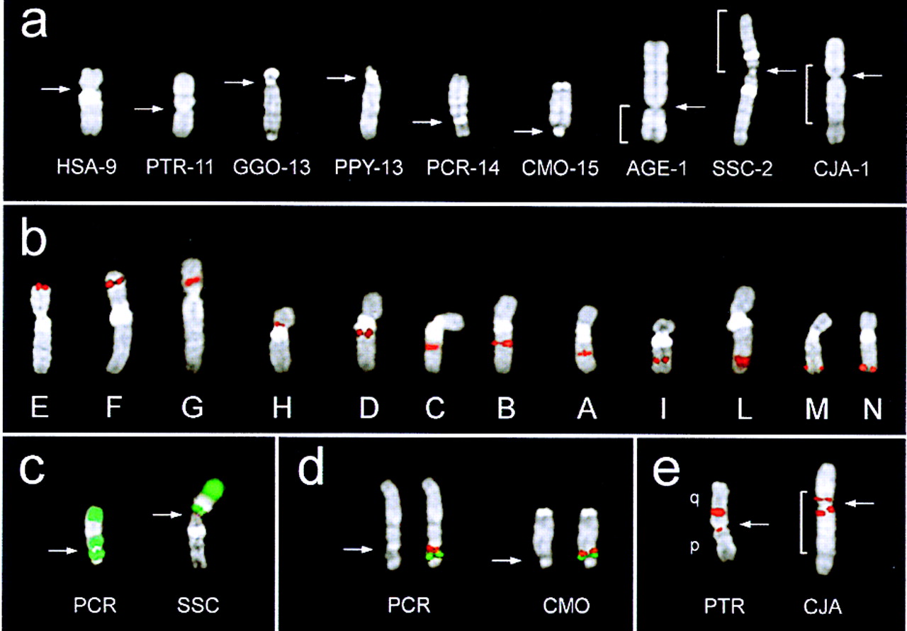 Examples of DAPI-banded phylogenetic chromosome IX from each species under study (a). Chromosome IX in AGE, SSC, and CJA is part of a larger chromosome. In all cases, however, the chromosome IX is uninterrupted. Brackets indicate the portion of chromosome IX. Some chromosomes are presented in an inverted orientation, with respect to the position of the centromere, to match the orientation reported in Fig. 2. The actual chromosome number in each species is reported on the right of the species acronym. (b) FISH signal of the 12 probes on human chromosome 9. The examples have been arranged fromleft to right in increasing mapping distance from 9pter. (c) Example of FISH signals (green) of PCP 29, specific for human 9q, on PCR (left) and SSC (right). (d) Example of a cohybridization experiment performed to establish the relative order of probes M (red) and N (green) in PCR and CMO. The DAPI-banded chromosome IX without signals is on theleft, to better show the morphology and centromere position. (e) The splitting of probe B in PTR and CJA (see text). The arrows point to the centromere.