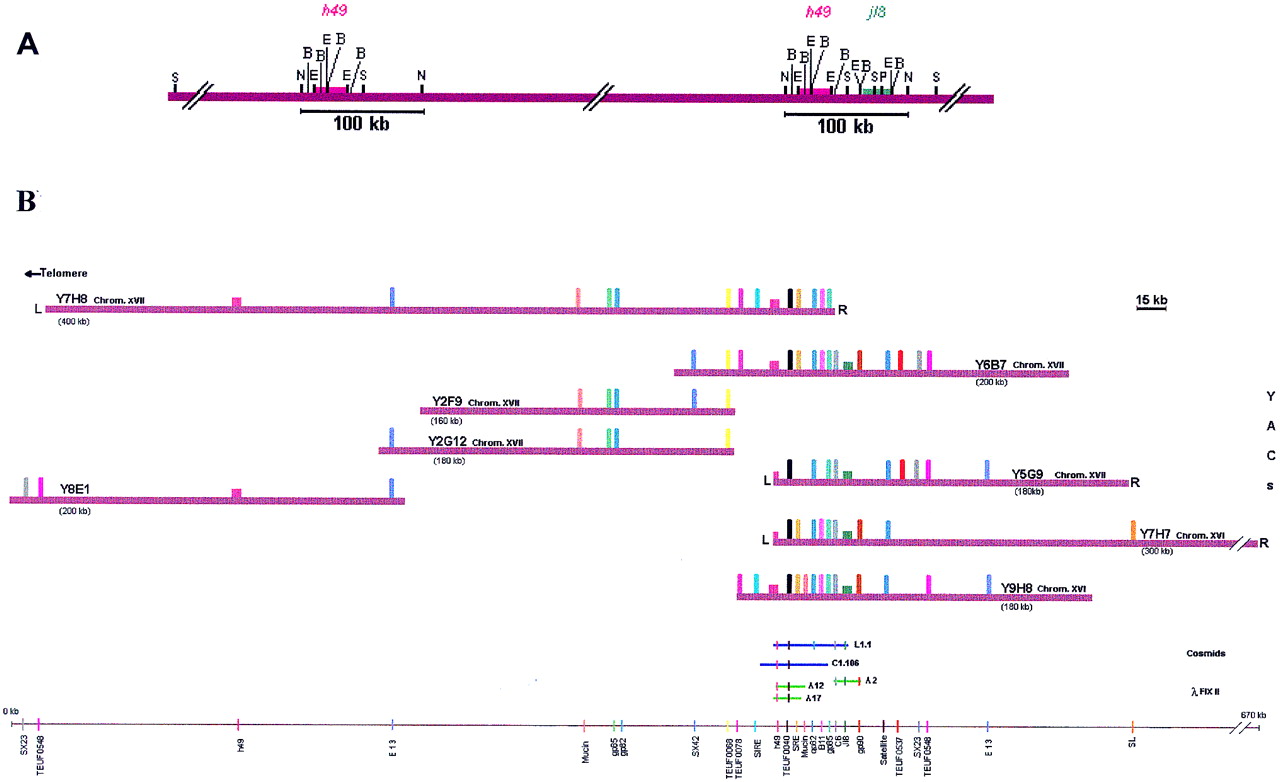 Megarestriction map and YAC contig of the region containing the locih49 and j18. (A) Megarestriction map of the region spanning the loci h49 and j18. As described in legend of Figure 1, T. cruzi chromosomal DNA and isolated chromosomal bands XVI and XVII were digested with different restriction enzymes, separated by conventional agarose gel electrophoresis or by PFGE, blotted into nylon membrane, and hybridized with probes H49 and JL8. Restriction enzymes: S, SfI; N, NotI; E,EcoRI; B, BamHI; P, PacI. Red and green boxes indicate the location of genes h49 and jl8, respectively. To facilitate comprehension, the multipleHindIII restriction sites within the repetitive region of geneh49, and HaeIII restriction sites within the repetitive region of gene jl8 were not represented. (B) Results of YAC contiging based on marker content of clones. A subset of 8 YACs, 2 cosmids, and 3 λ phages is shown. Marker ascertainment was carried out by PCR and dot blot hybridization. The exact order of markers has not been established, and the intermarker distances are not to scale. There are several discrepancies in the marker content of the map: markers SRE, gp85, gp90, mucin, and B11 are not contained in several YACs. Cosmids and λ phages containing genes h49 and jl8 are shown below the YACs. The YAC ends (L, left end; R, right end) were determined by inverse PCR (Materials and Methods).