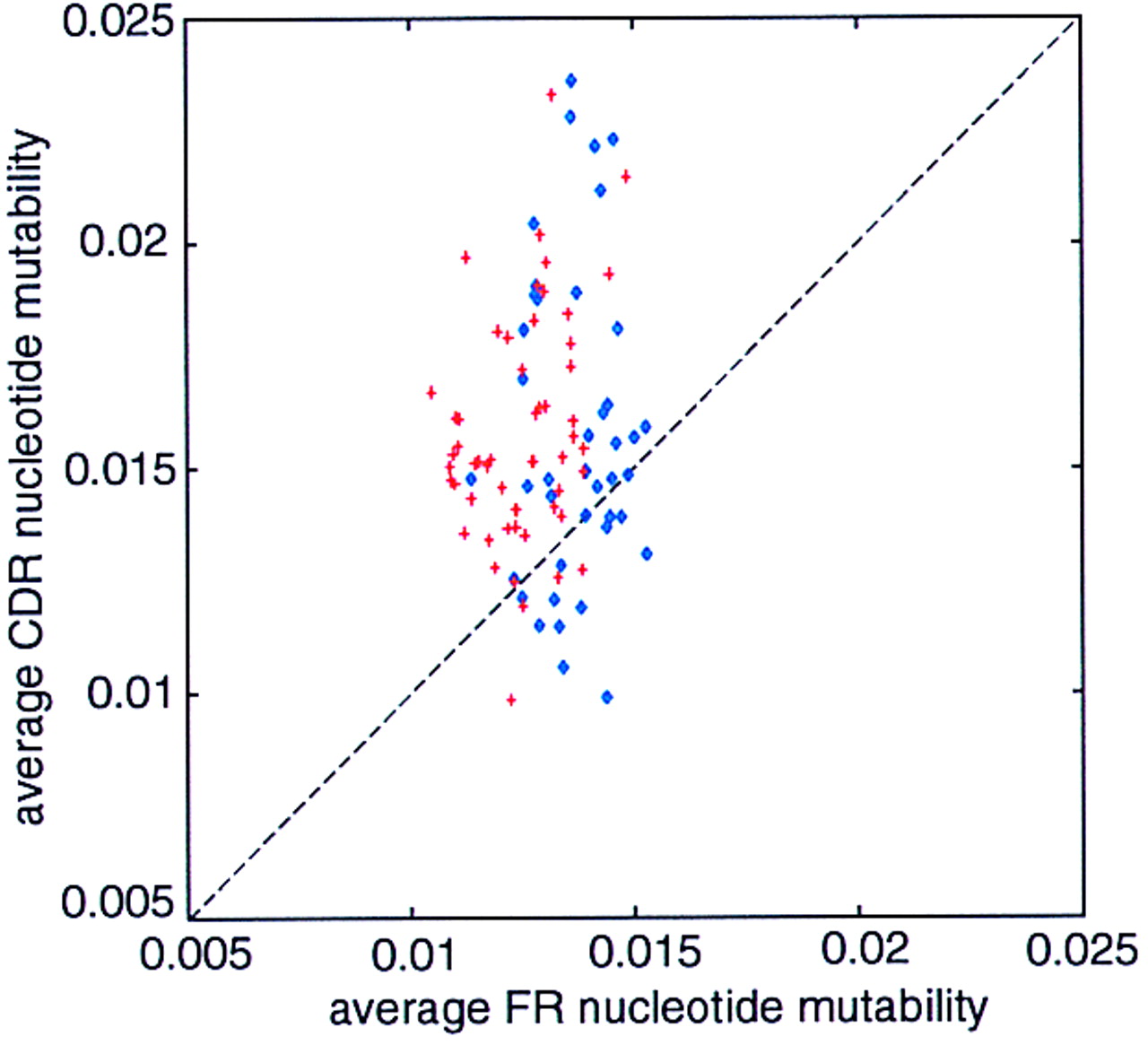 Scatter plot of the predicted FR vs. CDR nucleotide mutability values for the set of human TCRα (blue) and TCRβ (red) sequences.