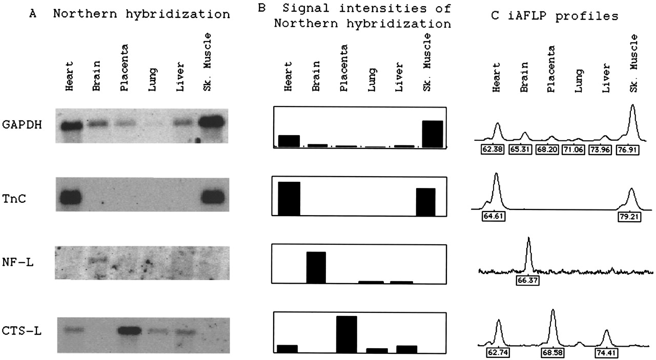 Comparison of Northern hybridization results with iAFLP profiles. The same set of six human tissue poly(A) RNAs was used for Northern blotting and cDNA synthesis in template pool preparation for iAFLP profiling. For each gene, Northern hybridization signals (A), intensities of those signals (B), and an iAFLP profile (C) are shown. Values below the iAFLP profile are sizes assigned for peaks by the GenScan software (PE Biosystems). On thex-axis is fluorescence intensities in arbitrary units measured by 377 sequencer (PE Biosystems). (GAPDH) Glyceraldehyde-3-phosphodehydrogenase; (Tn C) cardiac troponin C; (NF-L) neurofilament L; (CTS-L) cathepsin L.