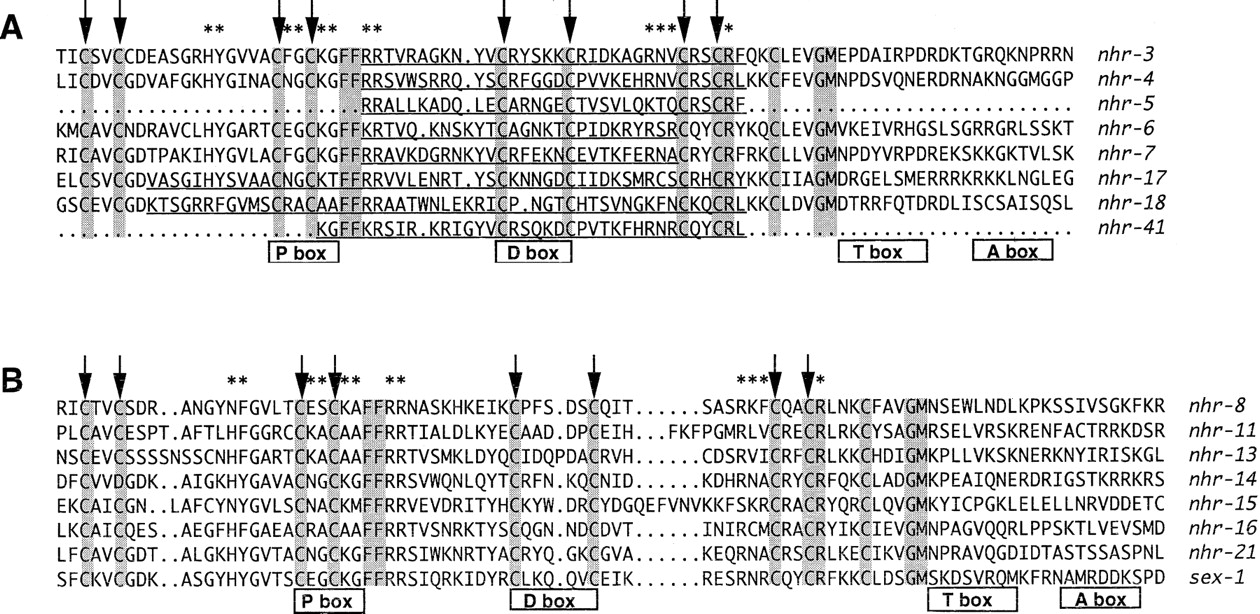 DBD sequences encoded by C. elegans NR genes described in this study. Shaded amino acids are conserved in all NRs other than the nematode exceptions noted in the text.. Arrows indicate the eight zinc-coordinating cysteines (four per zinc-binding module). Asterisks denote positions of residues found to make specific DNA contacts in the existing NR DBD X-ray crystal structures (Rastinejad 1997). Underlying rectangles in the core DBD indicate the P box sequences that are primary determinants of DNA-binding specificity and the D box dimerization interface (Gronemeyer and Laudet 1995). Also indicated are the T box and A box regions that contribute to dimerization and DNA binding, respectively, by some NRs (Gronemeyer and Laudet 1995;Rastinejad 1997). Alignments were generated using the GCG Pileup program (Devereux et al. 1984). (A) NR sequences identified by degenerate PCR amplification of genomic DNA. Amino acids encoded by the original amplification products are underlined. (B) NR sequences identified from expressed sequence tags. The nhr-14DBD sequences are from the corresponding genome project ORF prediction, as the cDNA sequenced was incomplete and did not extend to the DBD region.