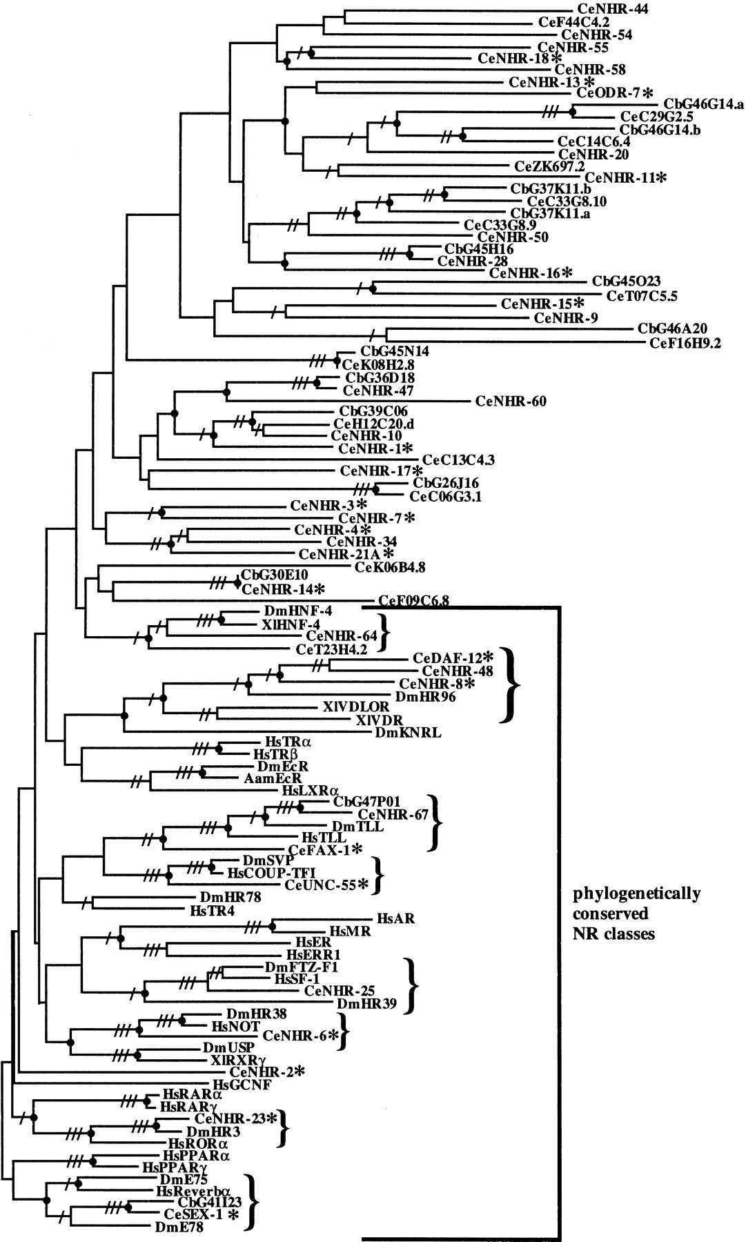 Neighbor-joining tree of selected NR core DBD sequences (as defined inRastinejad 1997) generated by the GCG Growtree program. One thousand neighbor-joining bootstrap replicates were performed on the same data set using the Paupsearch function of GCG 9.1. Bootstrap values for supported branches are indicated by hatch marks: (/) 50%-79%; (//) 80-94%; (///) 95-100%. Paupsearch was also used to perform maximum parsimony analysis; branchpoints preserved in the resulting consensus tree are denoted by dots. C. elegans sequences are included for all NR genes characterized in this or other studies (* and see Tables 1 T2 T3), all genes for which C. briggsae orthologs were identified, and selected representatives of other major groupings defined in a larger tree containing all 224 nontruncated nematode DBD sequences. Sequences not yet assigned nhr designations are indicated by genome project ORF numbers. Also included are all knownC. briggsae NR sequences (designated by clone name) and both vertebrate and insect sequences representing the major classes defined by Laudet (1997). Curly brackets indicate phylogenetically conserved NR classes that contain nematode members. Sequence name prefixes denote species of origin: (Aam) the tick Amblyomma americanum, (Cb)C. briggsae, (Ce) C. elegans, (Dm) Drosophila melanogaster, (Hs) Homo sapiens, (Xl) Xenopus laevis. Nematode sequences are available through the Genome Sequencing Project servers and, for C. elegans, in GenBank, and can be retrieved by text searches for the cosmid designation. GenBank accession numbers for previously published nematode sequences and non-nematode sequences included are (AF020187), AamEcR; (U37424), CeNHR-2; (U13075), CeNHR-23; (X51548), DmE75; (U01087), DmE78; (M74078), DmEcR; (M63711), DmFTZ-F1; (pir:S36218), DmHNF-4; (M90806), DmHR3; (X89246), DmHR38; (U31517), DmHR78; (U36792), DmHR96; (X14153,) DmKNRL; (M28863), DmSVP; (M34639), DmTLL; (X53417), DmUSP; X16155), HsCOUP-TFI; (L29496), HsAR; (X03635), HsER; (X51416), HsERR1; (U64876), HsGCNF; (U22662), HsLXRa; (M16801), HsMR; (X75918), HsNOT; (L02932), HsPPARα; (Z30972), HsPPARγ; (X06538), HsRARα; (M24857), HsRARγ; (X55066), HsReverba; (U04898), HsRORα; (U76388), HsSF-1; (Y13276), HsTL; (L27586), HsTR4; (X55005), HsTRα; (M26747), HsTRβ; (Z37526), XlHNF-4; (L11443), XlRXRγ; (X75163), XlVDLOR; (U91846), XlVDR.