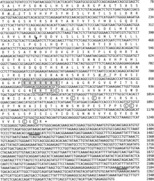 Nucleotide and predicted amino acid sequence of zebrafishgdf7. The ORF contains two potential proteolytic processing motifs (R-X-X-R); site 1 (boxed and shaded) and site 2 (boxed). Three N-linked glycosylation sites are located within the prodomain (underlined and in italics) and the mature domain contains seven conserved cysteine residues (circled). The sequence of the putative 3′ UTR contains two potential polyadenylation signals (thick underlined). (Arrowhead) Boundary between sequence obtained by 5′ RACE and sequence obtained from genomic DNA. The GenBank accession nos. for zebrafish gdf7 are AF113022 and AF113023.