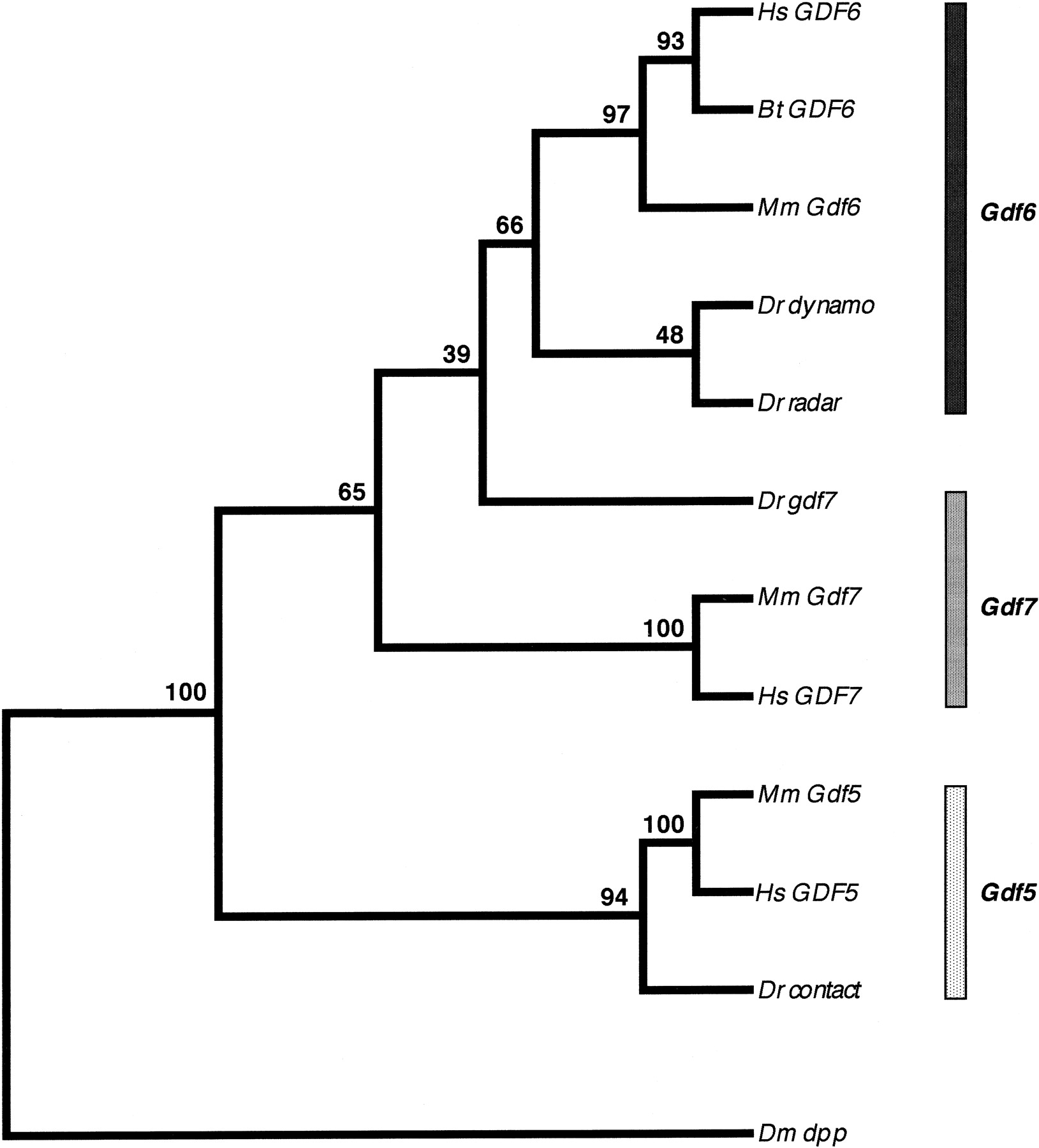 Phylogenetic relationships among members of the zebrafish and mammalianGdf5, 6, 7 subgroup of genes. A neighbor-joining bootstrap tree was generated from mature domain sequences and arbitrarily outgrouped to dpp. Numbers above each branch point indicate percent bootstrap values (1000 replications). On the basis of this analysis and the genetic mapping (Fig. 3), the genes can be classified into three orthology groups:Gdf5, Gdf6, and Gdf7 as indicated by the three shaded bars. (Bt) Bos taurus; (Dr) Danio rerio; (Hs) Homo sapiens; (Mm) Mus musculus; (Dm)Drosophila melanogaster.