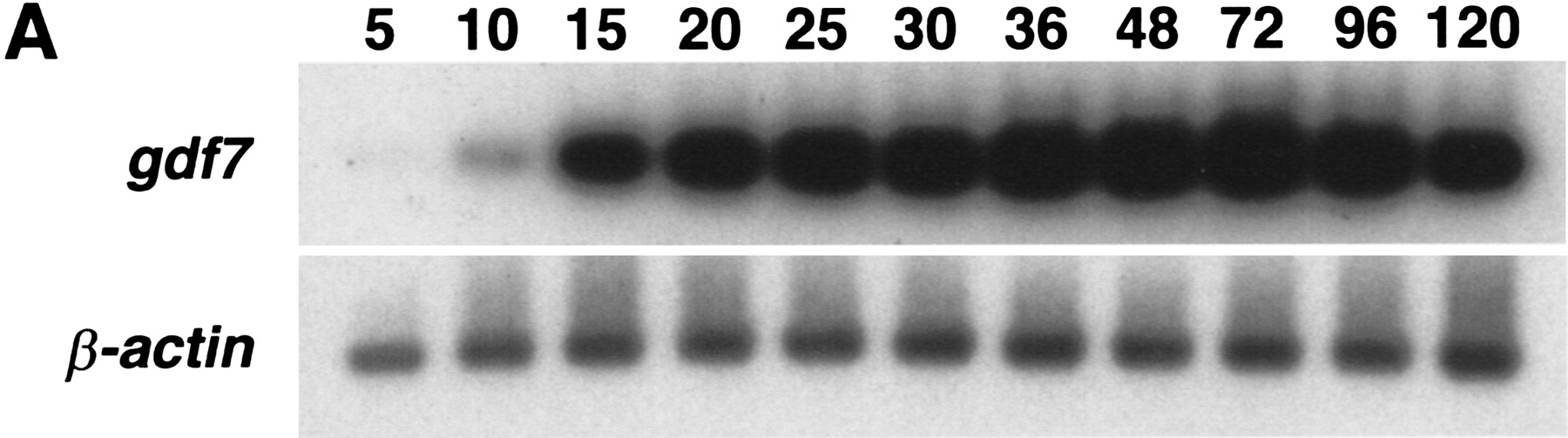 Embryonic and adult expression of gdf7. Total RNA was isolated from zebrafish embryos at selected stages from 5 hpf to 120 hpf (A) and from adult tissues (B). The expression ofgdf7 was examined by RT-PCR and the amplified products were detected following hybridization of an internal radiolabeledgdf7-specific oligonucleotide. The expression ofβ-actin was examined as a positive control for cDNA synthesis. (Br) brain; (He) heart; (Li) liver; (Ki) kidney; (Gu) gut; (Mu) muscle; (Te) testis; (Ov) ovary.