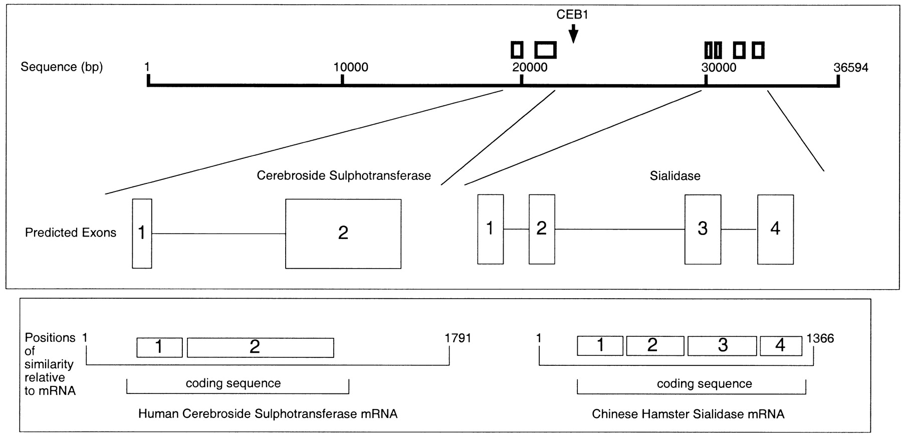 Putative genes near minisatellite CEB1. Predicted exons (bold boxes) related to cerebroside sulphotransferase and sialidase coding sequences are shown relative to the location of CEB1 (arrow) and to mRNA sequences (below).