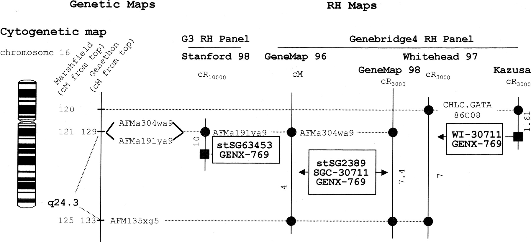 Localization of the GENX-769 gene in the integrated genome maps. The cytogenetic map presented is based on GENATLAS data. The genetic map is displayed with a scale in centiMorgans (cM) from the top of the chromosome according to the Marshfield (CHLC) and the Généthon maps. When the mapping result is expressed as a distance (with a significant lodscore) to a framework marker theGENX-769 marker is represented by a square. When localized in a given interval, the GENX-769 marker is written inside a box and points to this interval with a black arrow for odds >10:1 or lod score >1, a gray arrow for odds <10:1 or lod score <1. The microsatellites or other markers are reported as circles. The distances between markers of the RH maps are indicated in centiRay10000 (cR10000) for the G3 RH panel, in cR3000 for Gene Map ’98, Whitehead ’97, and Kazusa maps and in cM for Gene Map ’96. D numbers or aliases (AFMa304wa9) D16S3061; (AFMa191ya9) D16S3037; (AFM135xg5) D16S520; (CHLC;GATA86C08) 16S2625.