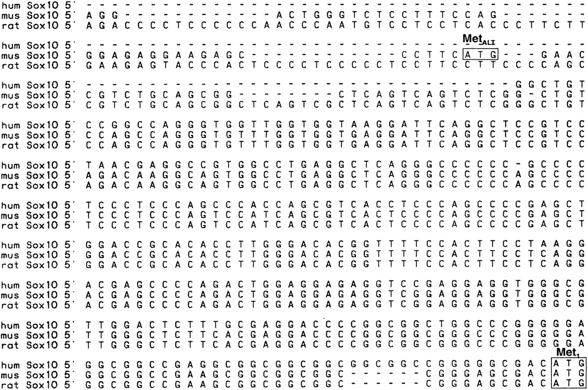 Comparison of mouse, human, and rat sequences 5′ of the initiation methionine (Met1, boxed) proposed by Kuhlbrodt and colleagues (Kuhlbrodt et al. 1998a). Coding sequences derive from cDNA (human; E.M. Southard-Smith, unpubl.; mouse GenBank accession no. AF017182; rat GenBank accession no. AJ001029) or genomic sequences (M. Angrist, unpubl.). An alternative start codon MetALT found in the mouse Sox10 5′ UTR is also boxed.