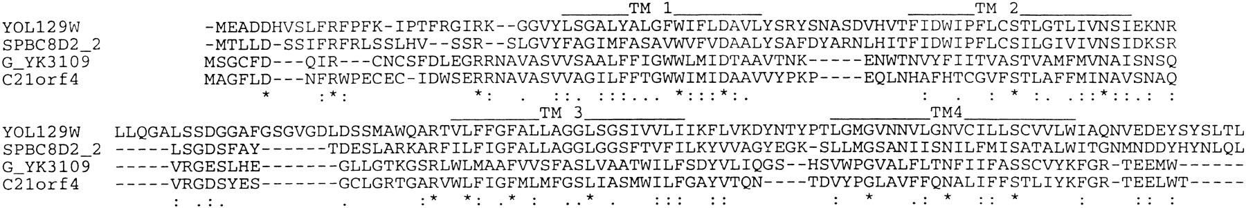 Sequence alignment of the human C21orf4 with its related proteins inC. elegans and in yeast. Predicted transmembrane domains are indicated TM1–TM4. YOL129w is from S. cerevisiae, SPC8D2_2 is from S. pombe, and G_YK3109 is from C. elegans. Identical (*), similar (:), and related (.) residues are indicated.