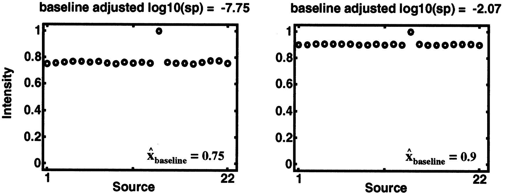 Discordancy statistical significance adjusted for baseline position. Synthetic intensity data vs. source for several different baselines, [0.25, 0.5, 0.75, and 0.9], are plotted. In each case, the number of samples (n = 22), the maximum intensity (xn = 1), and the traditional Dixon significance probability [log10(sp) = −20] are kept fixed. Constant Dixon statistical significance, regardless of baseline position, is achieved deliberately in these synthetic data by adjustingx n −1 according to equations 1–6. Hence, the gap (xn − x n − 1) necessarily decreases as the baseline increases; yet, the traditional Dixon statistical significance remains unchanged. The closer the baseline is to the maximum allowed intensity (i.e., 1), the less statistical confidence we can have in an outlier assessment. As can be seen in each panel, the baseline adjusted statistical significance decreases as the baseline increases toward the allowed maximum. The erosion of statistical confidence from the traditional Dixon significance as baselines are continuously increased toward the allowed maximum is plotted in Fig. 7 (see also Table 1).