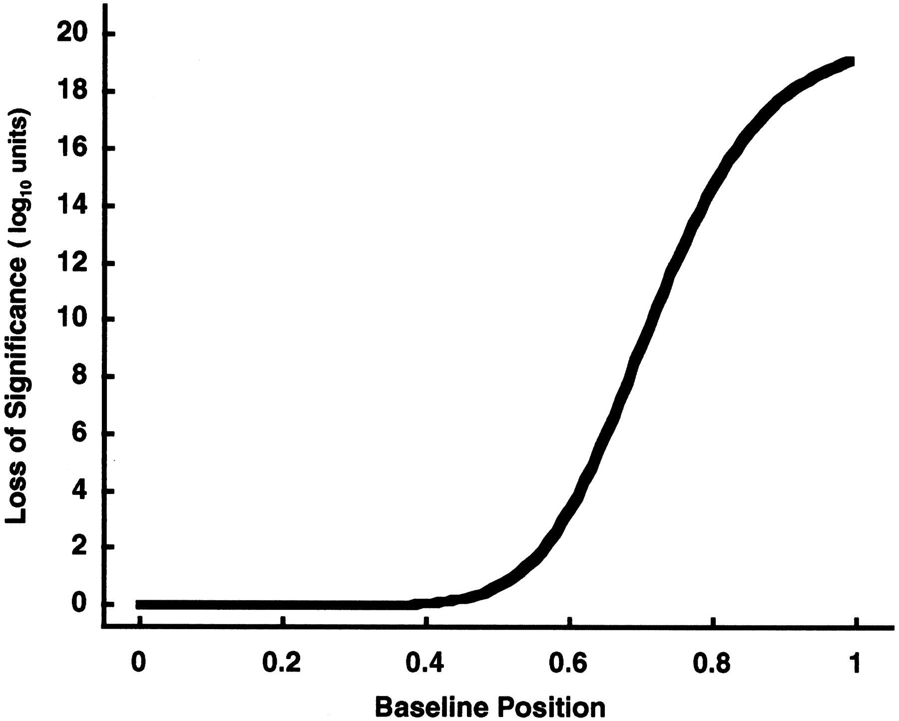 Erosion of confidence increases as the baseline position increases toward the maximum. The number of samples (n = 22), the maximum intensity (xn = 1), and the traditional Dixon significance probability [log10(sp) = −20) are kept fixed throughout this example as in Fig. 5. The resulting erosion of confidence, i.e., the loss of statistical significance Δlog10(sp) from the traditional Dixon value, is plotted continuously as the baseline increases toward the allowed maximum intensity (see also Table 1).