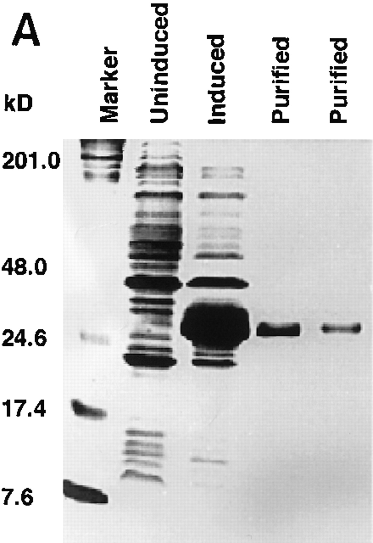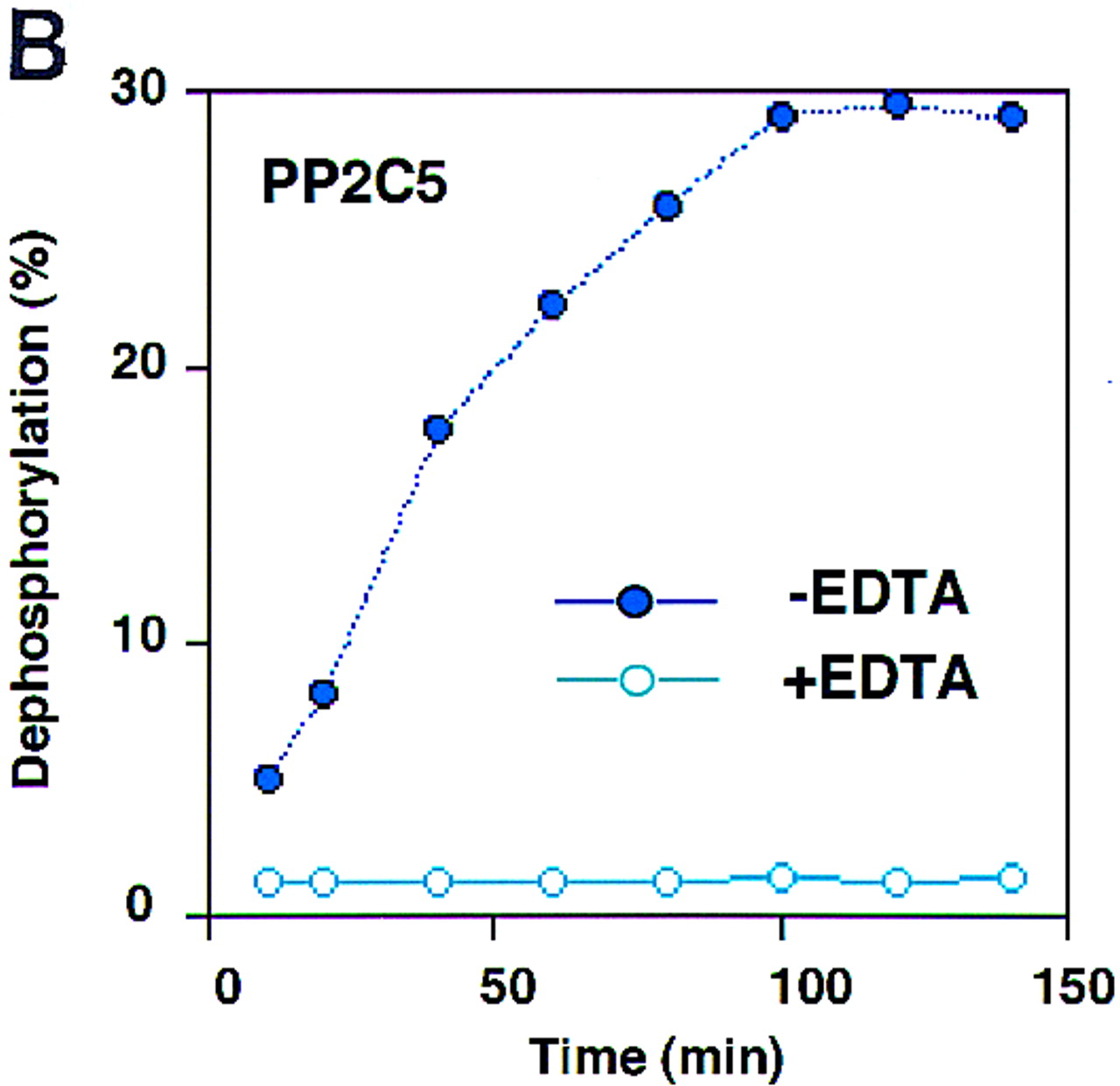 Purification of recombinant protein and enzyme activity assay. (A) Gene expression and protein purification of PP2C5. E. coli containing the recombinant expression plasmid was grown for 3 hr either under inducing or noninducing conditions. Following protein isolation, samples were analyzed on a 12% SDS-polyacrylamide gel. Fromleft to right, the samples were as follows: protein marker (prestained SDS-PAGE standards, Bio-Rad, 25 μg in 20 μl); PP2C5-noninduced total protein (40 μg in 40 μl); PP2C5-induced total protein (40 μg in 40 μl); purified PP2C5 protein (5 μg in 5 μl); and purified PP2C5 protein (2.5 μg in 2.5 μl). (B) Enzymatic activity assay for PP2C. One microgram of purified PP2C5 was used in each reaction. Each experiment was repeated twice. Each value represents the average of the two different experiments. Labeled protein was dephosphorylated at 30°C in a 10-μl solution [containing 50 mm Tris-HCl at pH 7.0, 0.1% (vol/vol) 2-mercaptoethanol, ∼3 × 105 cpm32P-labeled casein, ∼1 μg of recombinant protein, and either 10 mm Mg2+ and 10 mmMn2+ or the same concentration of cations plus 10 mm EDTA]. At each time point (min), 100 μl of 20% trichloroacetic acid (TCA) was added, incubated on ice for 5 min, and microcentrifuged at room temperature for 5 min to precipitate the protein. Radioactivity in 90 μl of supernatant and 20 μl of pellet was measured by scintillation counting. Dephosphorylation was expressed as a percentage of 32P released into the supernatant. (●) −EDTA; (○) +EDTA.
