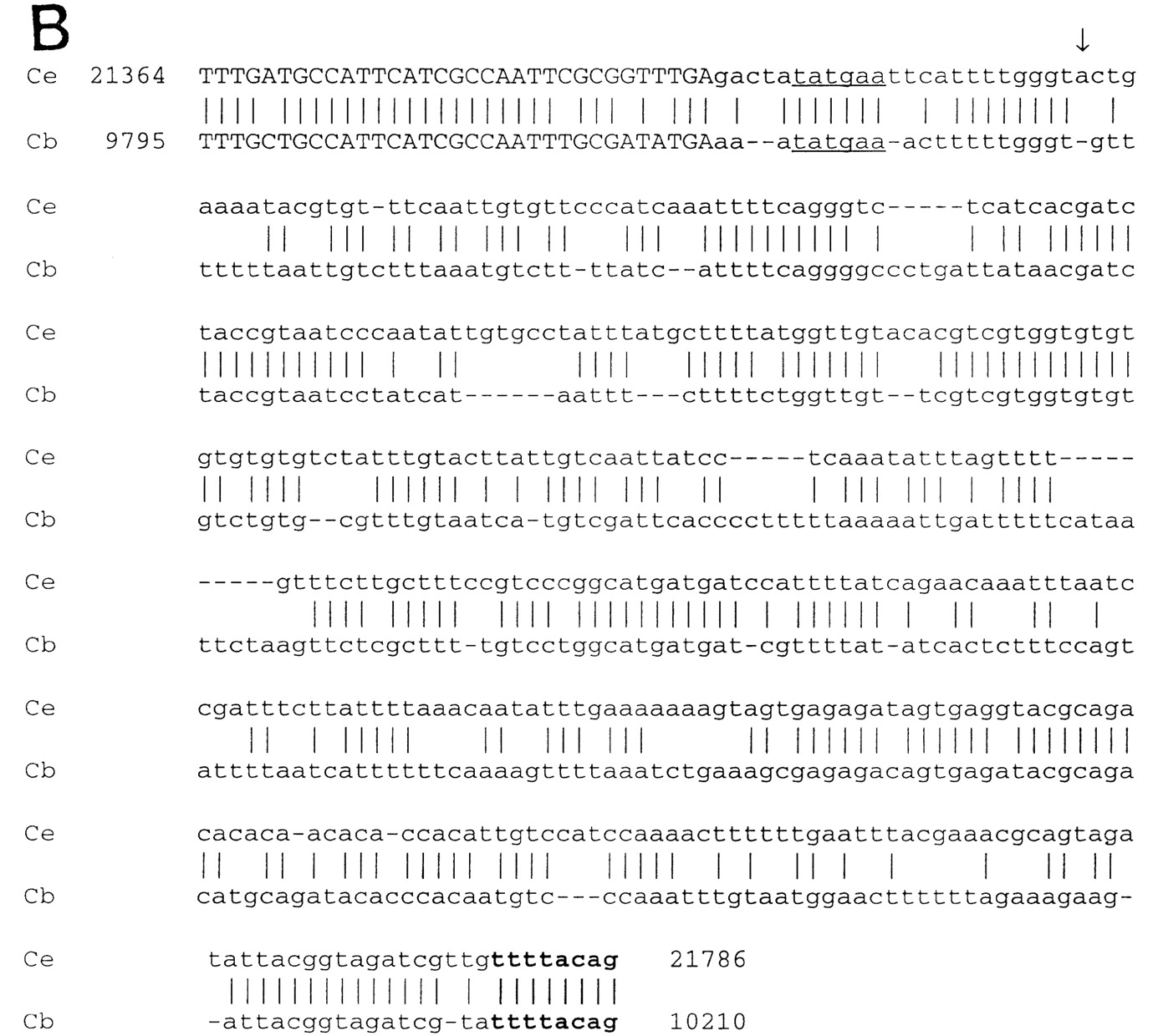Alignment of nucleotide sequences that comprise untranslated exon one and exon two from Ce–bli-4 (Ce) and Cb–bli-4 (Cb). The splice acceptor for the outron/exon one boundary and splice donor are in boldface type. The bli-4 initiator methionine is outlined within exon two. Exonic sequences are in uppercase, introns in lowercase. (B) Alignment of region VIII sequences fromCe–bli-4 with the corresponding region from Cb–bli-4. bli-4B predicted coding sequences are in upper case. Thebli-4B polyadenylation motif has been underlined, and the site of addition for the poly(A)+ tail is indicated by the vertical arrow. The splice acceptor within the intron has been highlighted in bold.