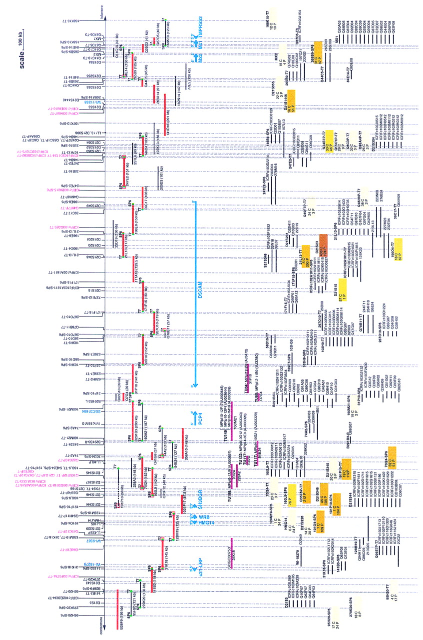 Contig and gene map between D21S3 and TMPRSS2. The sequenced MTP consists of two BACs, 20 PACs, and five cosmids depicted in red. Sizes of clones are indicated in parentheses. Markers are shown above the clone map: STSs are displayed in the lower layer; EST markers are in blue. NotI linking clones are marked with a dot. Riboprobes are shown in the upper layer; riboprobes in magenta correspond to the initial cosmid anchors (pockets are prefixed by ICRF and Soeda’s bins by Q). Riboprobes used for Southern hybridizations to confirm the contig are shown as follows: DIG riboprobes are marked by a green dot and 32P-labeled riboprobes by a red square at the end of corresponding clones. Known genes are depicted by blue lines below the clones. Transcription units (TUs) are indicated below the PACs in magenta. The raw primary data are shown below the actual MTP and gene map. Positive clone names are given for probes showing <20 hits. Color boxes correspond to probes identifying >20 clones for which only numbers are given (cosmids are indicated by a C and PACs by a P). Box color shadings are as follows: 20–50 hits are light yellow, 50–100 hits are yellow, 100–200 hits are dark yellow, and >200 hits are brown. Each probe is indicated above the clone stack.
