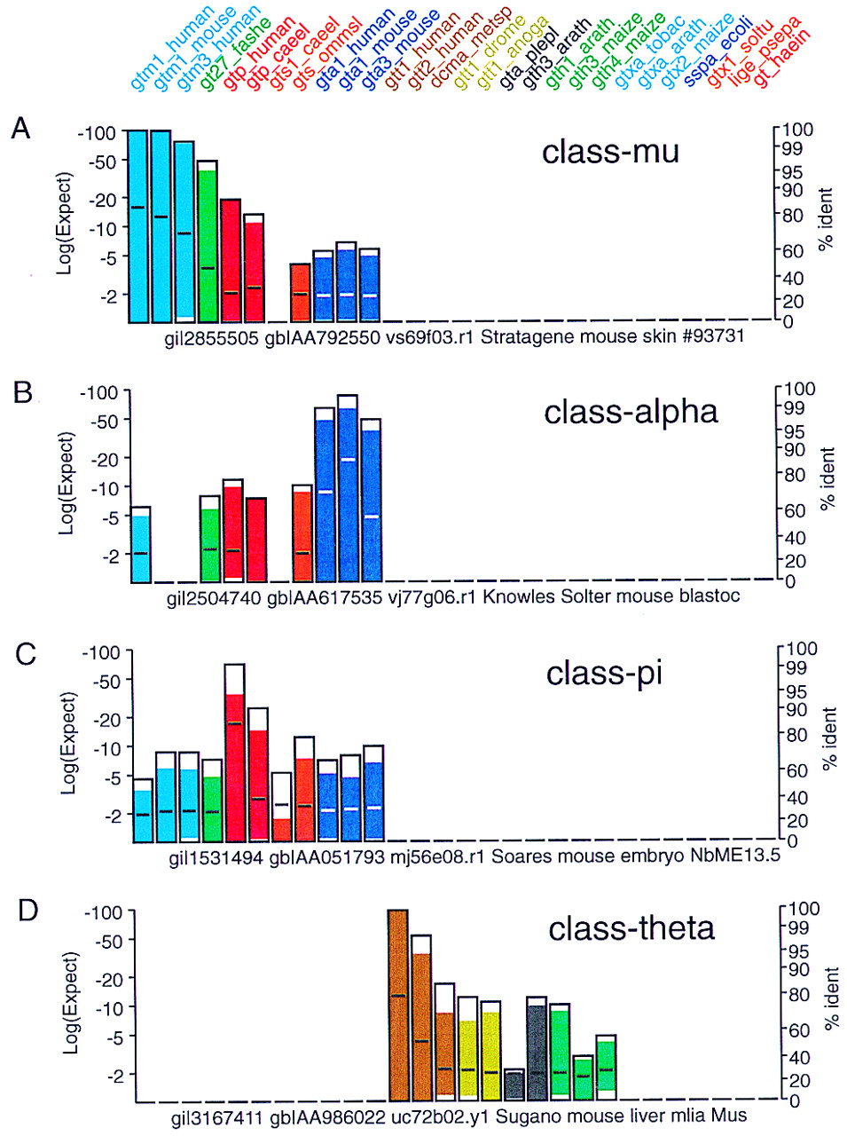 Known glutathione transferase family members. Typical profiles for matches between ESTs encoding members the four well-known mammalian glutathione transferase families: class alpha, class mu, class pi, and class theta. Searches were performed with the glutathione transferase query sequences indicated at the top of the Figure against the est_mouse database obtained from the National Center for Biotechnology Information (http://ncbi.nlm.nih.gov/blast/db/est_mouse) using the tfasty3 program with the default scoring parameters: the BLOSUM50 matrix and −15 for the first residue in a gap, −3 for additional residues, and −20 for frameshifts between or within codons (−15/−3/−20/−20). Matches against class-mu (gi‖2855505), class-alpha (gi‖2504740), class-pi (gi‖1531494), and class-theta (gi‖3167411) ESTs are shown.