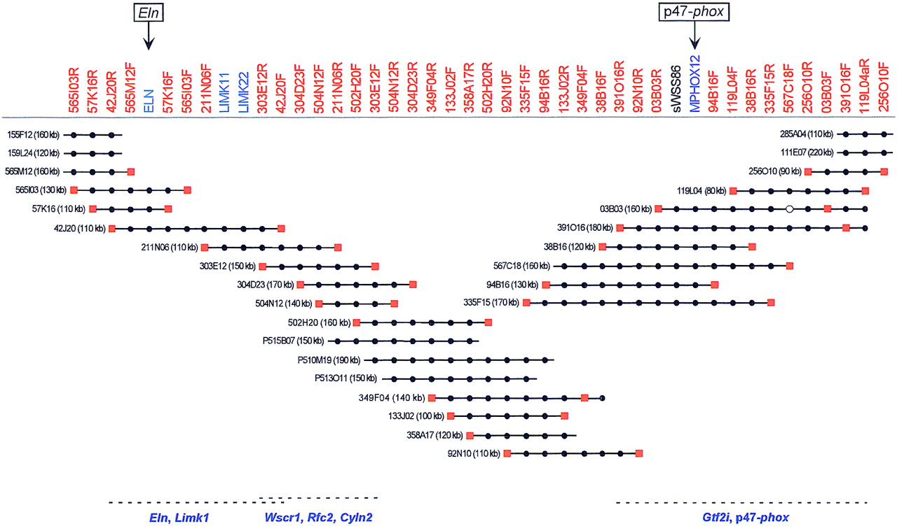 BAC/PAC-based STS-content map of the mouse WS region (oriented with centromere leftward and telomere rightward). The deduced positions of 44 STSs are depicted along the top, with the indicated clones shown as horizontal lines below. Relevant information about the STSs is available in GenBank (http://www.ncbi.nlm.nih.gov). The STSs were developed from clone insert ends (red), known genes (blue), or a conserved human DNA sequence (black). (●,◼) The STS is confirmed to be present in that clone by PCR testing. When an STS corresponds to a clone insert end, a red square is present at the end of the clone from which it was derived. PAC clones are indicated with a P at the beginning of their names. Four of the BAC clones were isolated from the Genome Systems C57BL/6 mouse library (111E07, 285A04, 155F12, and 159L24), with the rest of the BACs coming from the Research Genetics CITB–CJ7-B mouse library. The size of each BAC/PAC, as assessed by pulsed-field gel analysis, is also provided. The indicated BAC/PAC overlaps were confirmed by restriction enzyme digest-based fingerprint analysis (Marra et al. 1997; data not shown). The depicted clones together span ∼680 kb of DNA from mouse chromosome 5. Preliminary genomic sequence analysis has revealed the presence ofEln, Limk1, and part of Wscr1 in BAC 42J20,Wscr1, Rfc2, and Cyln2 in BAC 303E12, andGtf2i and p47–phox in BAC 391O16, as indicated along the bottom (U. DeSilva and E.D. Green, unpubl.).