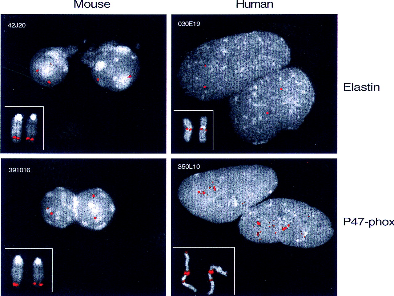 Human–mouse comparative FISH analysis of the WS region. Representative BAC clones from the ELN/Eln- and p47–phox-containing regions were selected from the physical maps of the human and mouse WS region. FISH analyses were performed on both metaphase chromosomes (insets) and interphase nuclei (main panels). Clones containing ELN/Eln (RG030E19 and 42J20) show a hybridization pattern on human chromosome 7q11.23 and mouse chromosome 5G2 typical of a single-copy segment. In mouse, the p47–phox-containing BAC (391O16) also produces a single-copy signal on metaphase and interphase chromosomes. In contrast, the human p47–phox-containing BAC (RG350L10) produces a very large and intense signal on metaphase chromosomes at 7q11.23 and multiple fluorescent dots on interphase chromosomes (also see Table 1). Sequences that cross-hybridize to the p47–phox BAC are encountered in 7p22 and 7q22 in human, in addition to the cluster in 7q11.23. We note that there is overlap between these locations and the sites detected with probes for PMS2-related sequences (Nicolaides et al. 1995).