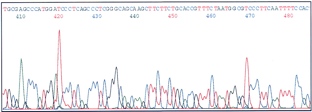 Electropherogram of cDNA-containing plasmids prepared by this system. The prepared plasmids were dissolved in TE buffer, precipitated with ethanol, and, then, sequenced. The dye-terminator sequencing kit (Perkin-Elmer) and an ABI 377 DNA sequencer were used.