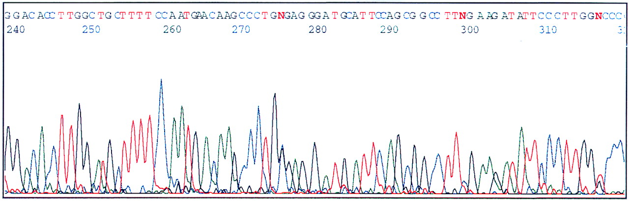 Electropherogram of insert cDNA-containing plasmids prepared by this system and sequenced by transcriptional sequencing. DNAs were dissolved in TE buffer, precipitated with ethanol, and, then, sequenced. Sequencing was as described previously (Sasaki et al. 1998a,b; Izawa et al. 1998). An ABI 377 DNA sequencer was used to anlayze the sequence.