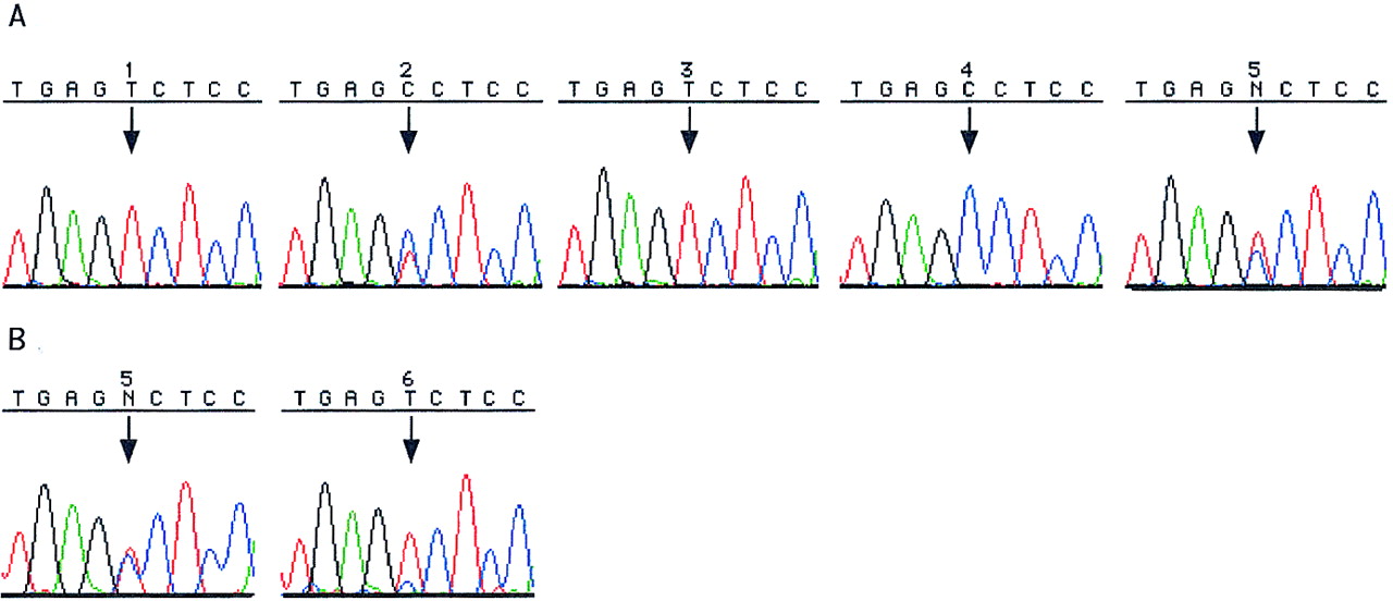 The results of scanning sWXD3868 for SNPs by method 1 is shown in A. CEPH parents are 1, 2, 3, 4, and the CEPH population pool is5 (additional detail about DNAs used are included in Methods). Sequencing was done with the dRhodamine terminators in A. The results for method 2 are shown in B. The CHM1 is sample 6 and the CEPH population pool is sample 5. Sequencing was done with the BigDye terminators in B. (↓) SNP locations. The small blue underhand for the T peak (↓) in B, sample 6 is a common sequencing artifact and was seen in a number of T peaks in this sequencing trace.