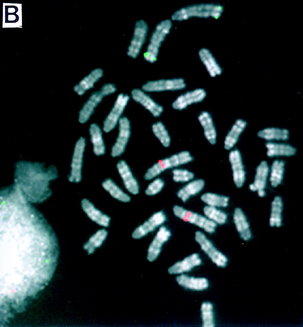 Dual-color FISH mapping of BACs on high-resolution reverse-banded mouse chromosomes. Two differently labeled BACs (biotin and digoxigenin) were cohybridized and detected simultaneously on R-banded chromosomes. (A) BAC 412F6 (green) maps on MMU6F2-3; BAC 412E19 (red) maps on MMU2C2. (B) BAC 412G6 (green) maps on MMU2H4; 412F19 (red) maps on MMU1C2.