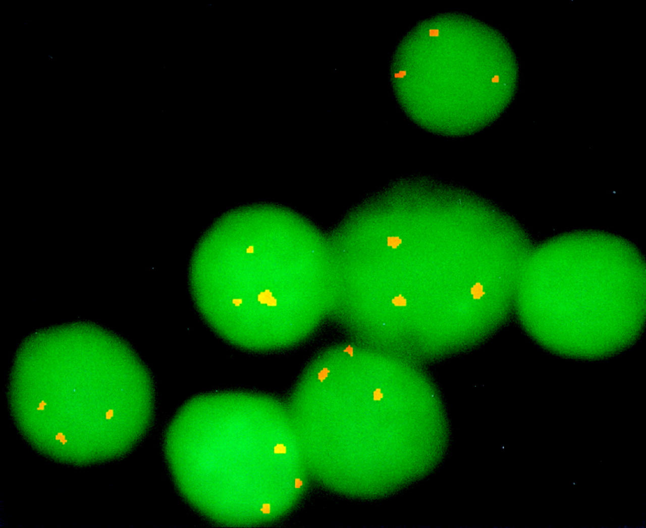 Trisomy 16 detected in interphase cells by the chromosome 16 telomeric BAC. BAC 43D12 linked to D16Mit52 was used to define cells from the Ts16 mouse model of Down syndrome. Three sets of FITC signals are clearly seen on 90% of interphase cells in contrast to probes from other chromosomes that produce just two pairs of signals (data not shown).