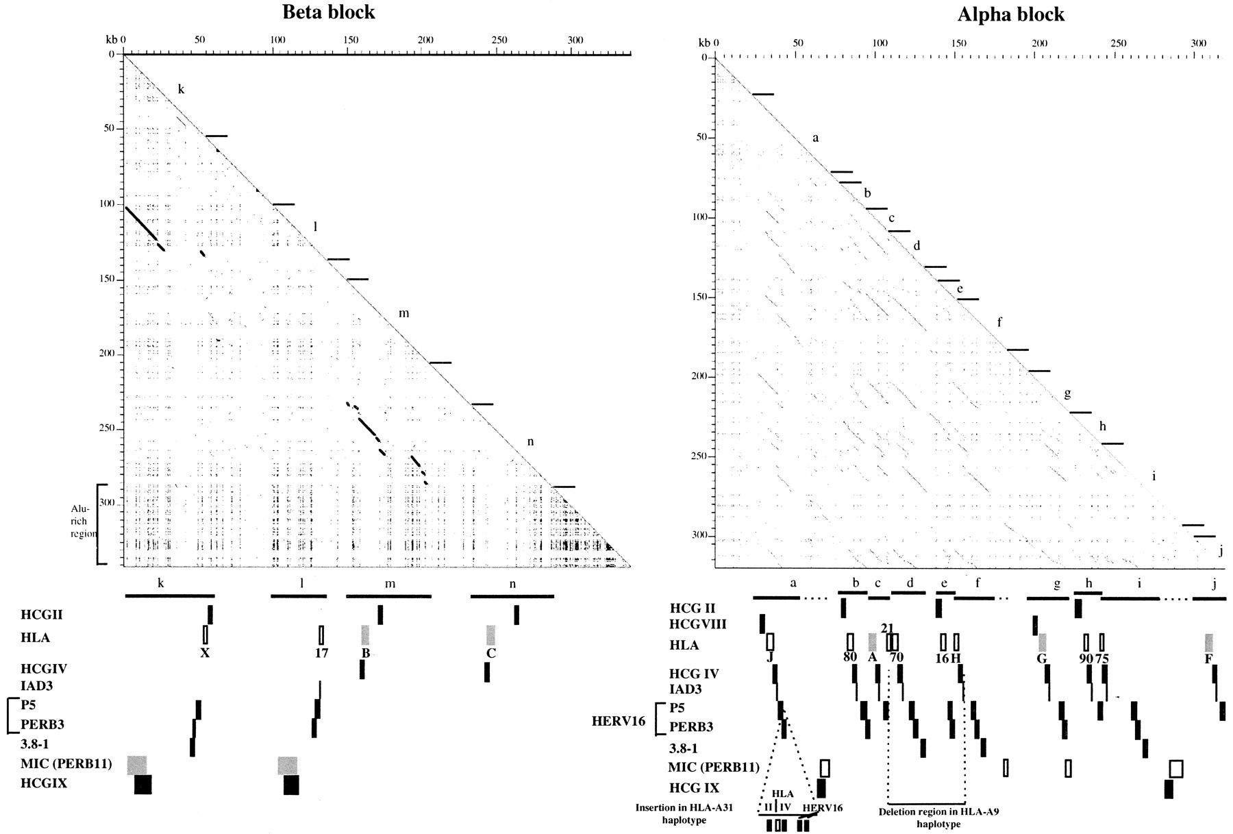 Segmental duplication of linked multicopy gene families. Dot-plot analysis of the intracomparison of the alpha (right) and beta (left) blocks. Diagonal lines within the dot plots indicate regions of duplication, with interruptions corresponding to indels. The position of the multicopy gene families HLA class I, HCG (II, IV, VIII, and IX), 1AD3, P5 + PERB3 (HERV-16), 3.8-1, and MIC (PERB11) are shown below the x-axis. Based on the duplication end points in the dot plot and the ordering of the multicopy gene families, duplicated segments have been designated a–n. In the alpha block, there is minimal distance between duplicated segments indicating that the duplication of the MIC (PERB11) members may have involved, though less likely, a neighboring segment. For the well-characterized HLA class I and MIC (PERB11) members, transcribed genes are indicated by shaded boxes, and pseudogenes and gene fragments are shown by open boxes. The HCG, 1AD3, and HERV-16 families are shown by black boxes. The endpoints of the human haplotype indels are indicated by horizontal dashed lines. Segment j is truncated at the 3′ end following anAlu Ya5/8 insert coinciding with the end of the alpha block sequence (accession no. AF055066). An Alu-rich region in the beta block is indicated.