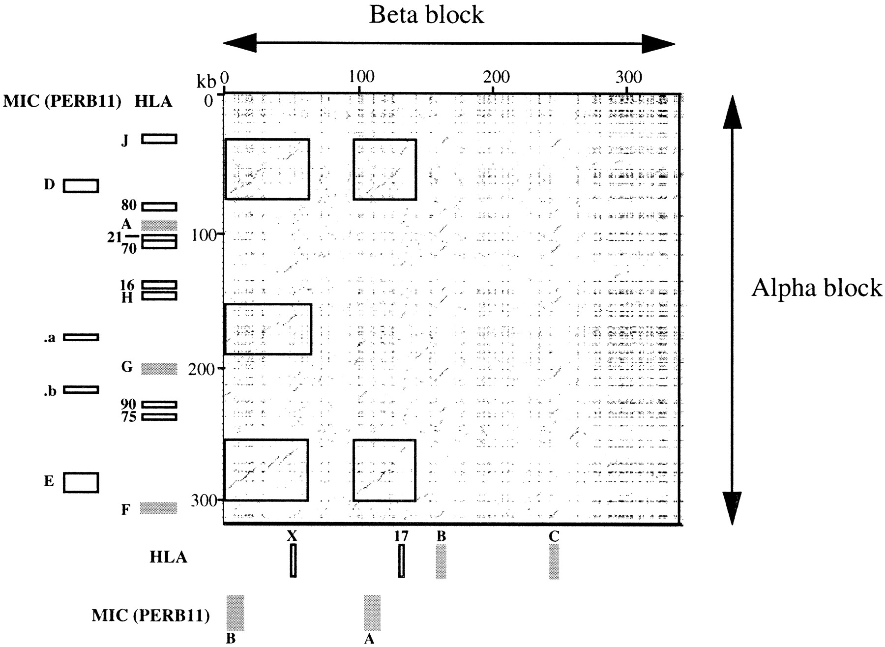 Different orientation and complexity of segments in the alpha and beta blocks. Intercomparison of the alpha and beta blocks. The orientation of the duplications shown by the small diagonal lines indicates that the segments from the two blocks are in opposite orientation to each other. Large segment duplications corresponding to segments containing MIC (PERB11) and HLA class I members are shown by boxes. For the well-characterized HLA class I and MIC (PERB11) members, transcribed genes are indicated by grey boxes, and pseudogenes and gene fragments are shown by open boxes along the x- and y-axes.