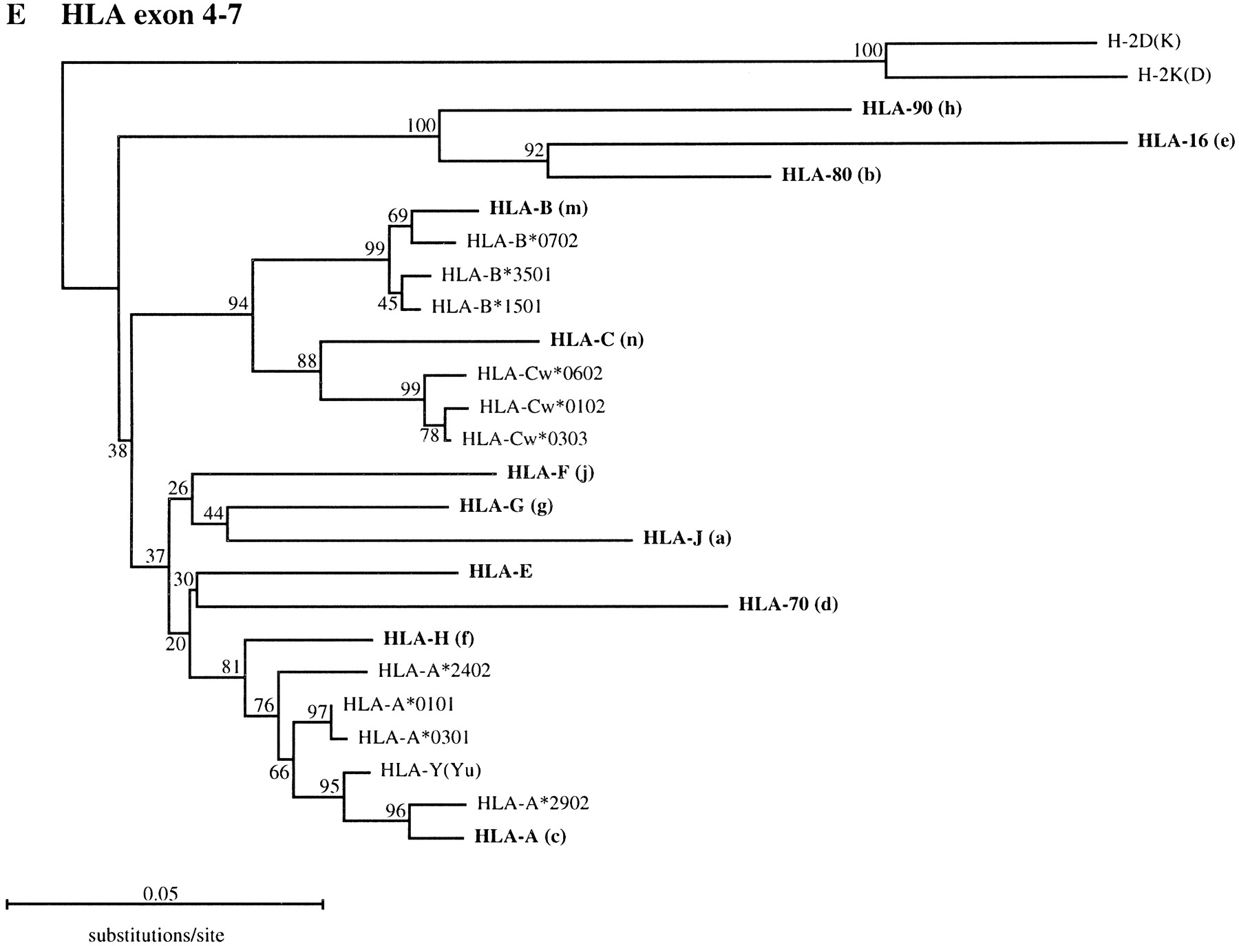 The alpha block segments can be separated into two main groups. The phylogenetic relationships of segments a–n were examined by analyzing the multicopy gene families of 1AD3 (A), HCGIV (B), HCGII (C), HERV-16 (D), and HLA class I (E). A scale bar for the number of substitutions per site is included for each tree and the bootstrap percentage from 1000 replications is given for each node. All trees except the HLA class I tree are unrooted. In the HLA class I tree (E), mouse H2 sequences were used as an outgroup and segments corresponding to HLA class I loci are indicated by brackets.
