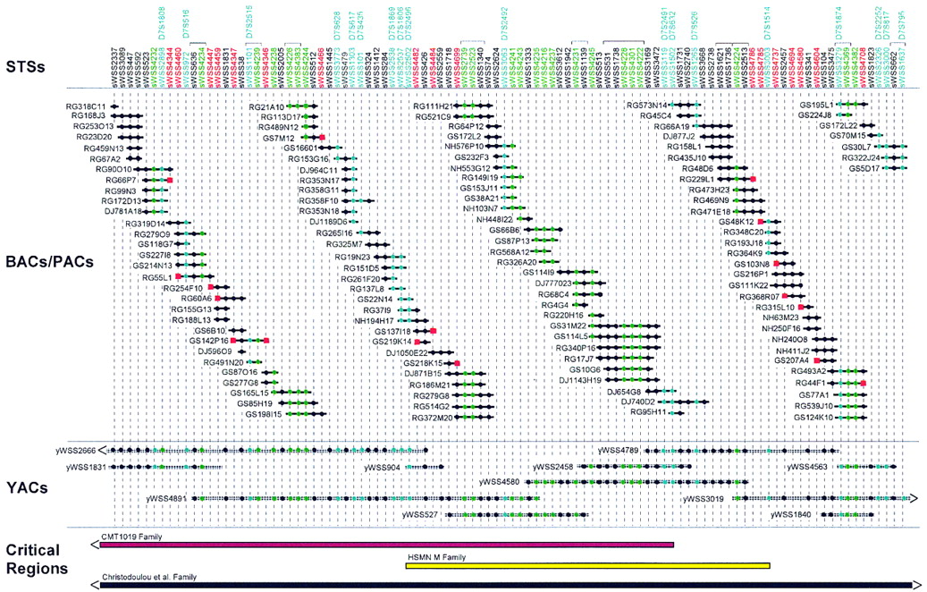 Clone-based physical map of the CMT2D critical region. A bacterial clone (BAC and PAC)-based STS-content map of theCMT2D critical region is depicted (oriented with 7pterleft and 7cen right). The deduced positions of 100 STSs are depicted along the top, with the indicated clones shown as horizontal lines below. Relevant information about the STSs is available in GenBank (see http://www.ncbi.nlm.nih.gov). Bacterial clones are named starting with the following prefixes that reflect their library of origin: (RG) Research Genetics BAC library; seehttp://www.resgen.com, (GS) Genome Systems BAC library; seehttp://www.genomesystems.com, (NH) Roswell Park Cancer Institute BAC library RPCI-11; see http://bacpac.med.buffalo.edu, and (DJ) Roswell Park Cancer Institute PAC library RPCI-4 or RPCI-5. A solid circle indicates that the STS is confirmed to be present in that clone by PCR testing. When an STS corresponds to a BAC insert end, its name is shown in red and a red square is present at the end of the clone from which it was derived. STSs corresponding to genetic markers and genes/ESTs are indicated in blue and green, respectively (both the STS name and the corresponding solid circles). In the case of the genetic markers, the corresponding D7S number is indicated above the name of the STS. Groups of STSs that could not be ordered based on the STS content of the BACs, PACs, and YACs are indicated with brackets above their names. STSs are depicted in an equidistant fashion from one another. The indicated BAC/PAC overlaps were confirmed by restriction enzyme digest-based fingerprint analysis (data not shown) (Marra et al. 1997). Shown below the BACs and PACs is a small, representative set of YACs spanning the region [see Bouffard et al. (1997b) andhttp://www.nhgri.nih.gov/DIR/GTB/CHR7 for additional details about the complete YAC contig map]. The YACs were not tested for the presence of some of the newly developed STSs; in these cases, a solid circle is not indicated at the appropriate position in the clone. Along thebottom are depicted the CMT2D critical regions as defined by genetic analysis of the CMT1019 family (Ionasescu et al. 1996; see Fig. 1), the HSMN M family (Sambuughin et al. 1998), and the family reported by Christodoulou et al. (1995). Note that the end(s) of the critical regions defined by the first and last families extend beyond the interval covered by the depicted contig map.